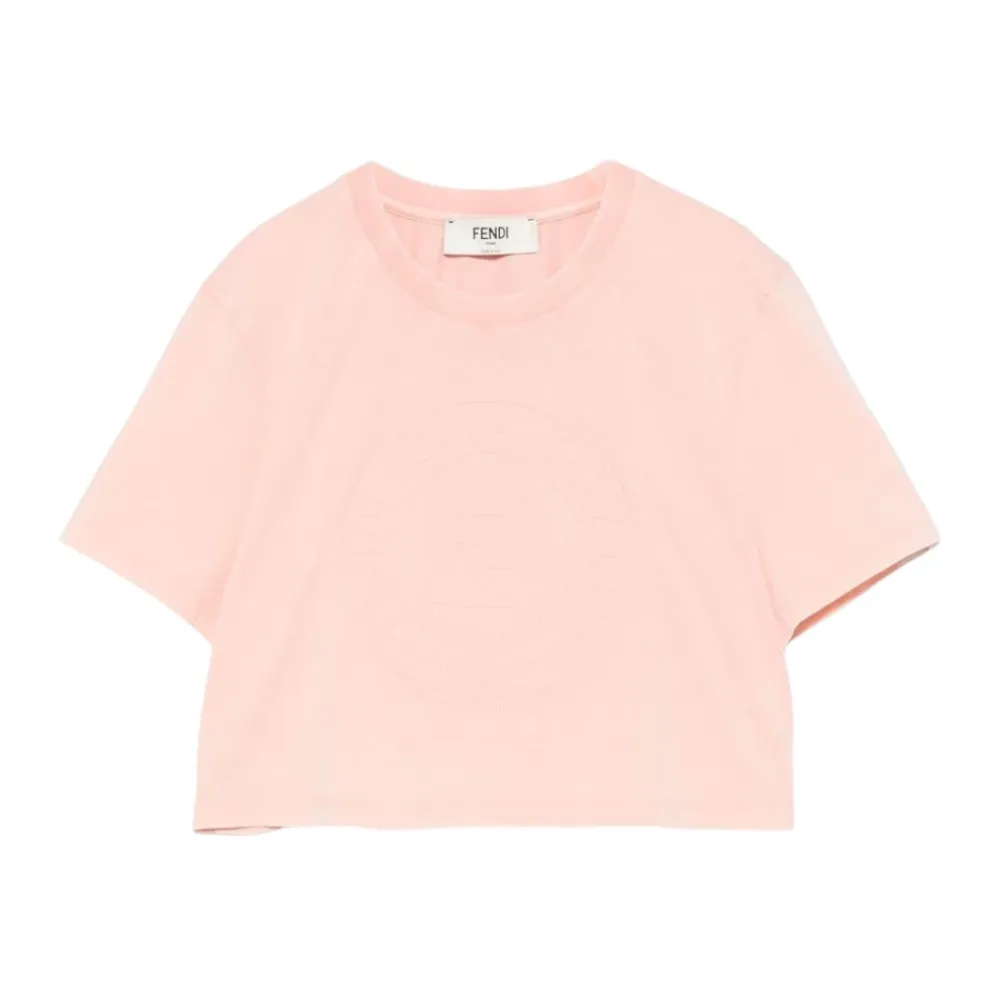Fendi Embossed FF Logo Cropped T-Shirt kombinerer en minimalistisk, cropped silhuet med et karakteristisk, præget FF-logo på brystet. Designet til afslappet hverdagsbrug, og tilbyder et sofistikeret, men casual valgmulighed til alsidig styling. Nøgleattributter: Pink | Straberry cream | Cropped silhuet | Præget FF-logo på brystet | Minimalistisk design | Dimensioner & pasform: Afslappet pasform