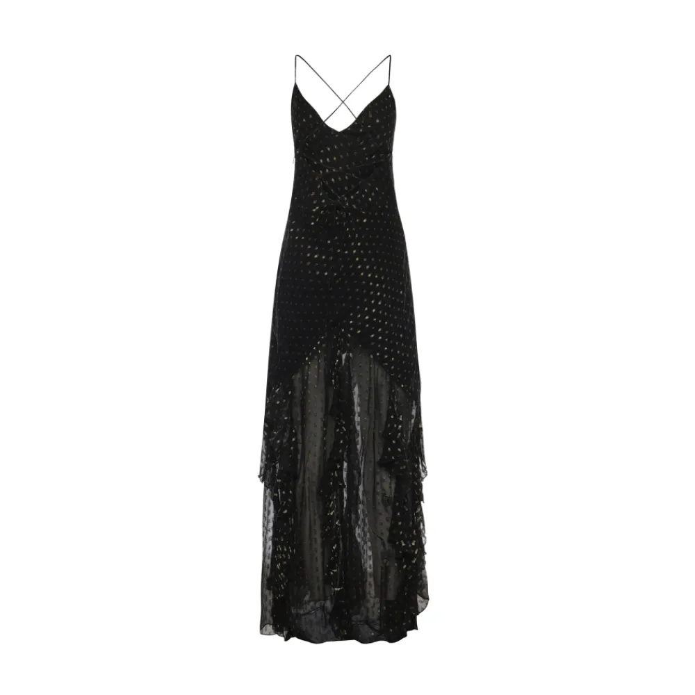 For Love & Lemons Elea Maxi Kjole kombinerer kaskader af flæser med en lav binderyg for en elegant, feminin maxi silhuet, der er ideel til arrangementer og aftenbrug. Vigtige egenskaber: Sort | Viskose | Justerbare skulderstropper | Lukning med bindebånd i ryggen | Kaskadeflæseskørt | Åben ryg med bånd | Flæselag | Dimensioner og pasform: Modellen er iført størrelse XS | Normal i størrelsen | Sammensætning og pleje: 100% viskose | Rens anbefales. Lægges fladt til tørring. Stryges ved lav varme om nødvendigt.