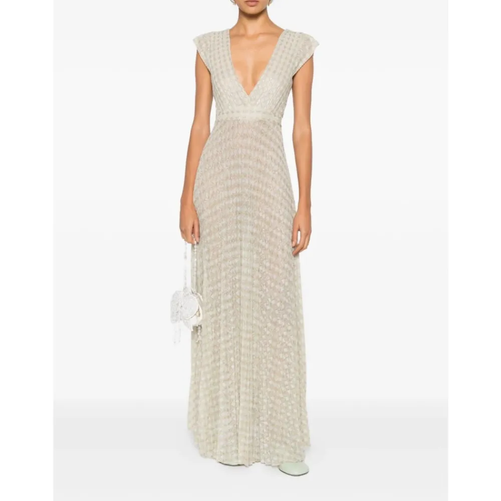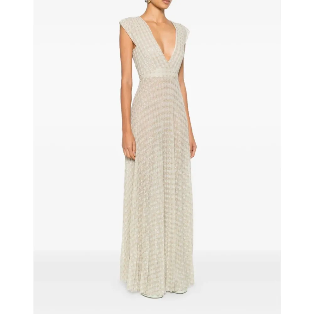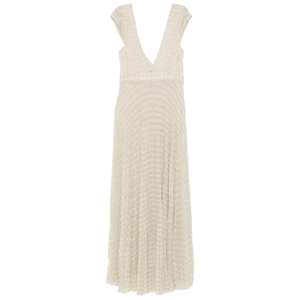Forte Forte Diamond Plisseret Jersey Kjole kombinerer en dyb V-udskæring med en lang, plisseret silhuet og subtil lurex-glimmer – designet til elegant festtøj og formelle begivenheder. Nøgleattributter: Beige | Ivory | Viskose jersey | V-udskæring | Uden ærmer | Diamantplisseret skørt | Dyb V-udskæring foran og bagpå | Lurex tråddetaljer | Figursyet overdel med blødt udstående skørt | Sammensætning & pleje: 70% viskose | 15% polyester | 15% polyamid | Lurex metallisk tråd