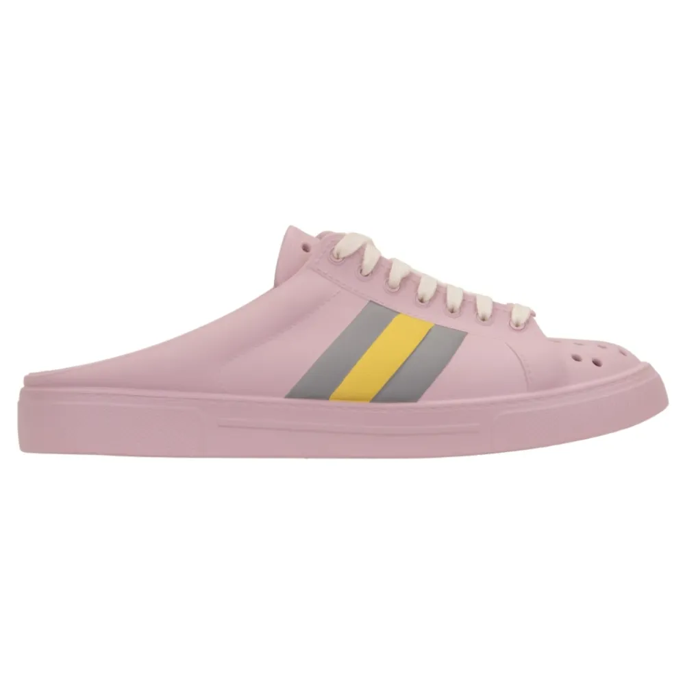 Gucci Rubber Mules – fremstillet udelukkende af gummi med en rund, perforeret tå og tofarvede sidestriber for et distinkt, men praktisk look. Fremstillet i Italien; ideel til afslappet, let anvendelig styling. Vigtigste egenskaber: Pink | Rosa | Gummi | Holdbar gummisål | Rund, perforeret tå | Tofarvede striber på begge sider | Græsk-inspireret motiv på sålen | Mål og pasform: Hæl (cm): 2,5 | Sammensætning og pleje: Gummi