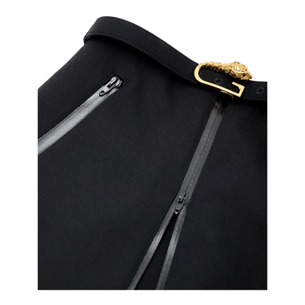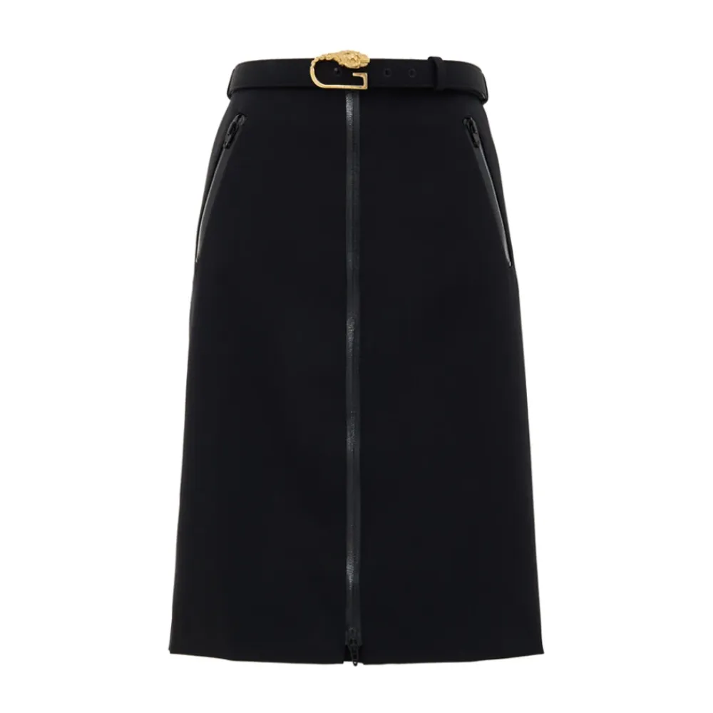 Sort Gucci Nederdel med Lynlås og Bælte. Har et aftageligt stofbælte med guldlås-logo i taljen. Lang central lynlås med latexdetalje, to synlige lynlåslommer i siderne. Mellemlang længde, let svajet model med strækbart stof. Sammensætning: 98% Uld, 2% Elastan. Intern SKU: 25GIU188 Brand SKU: 761364Z8BPC1000