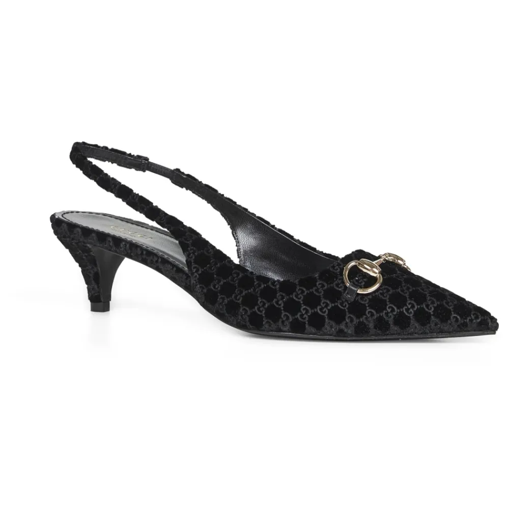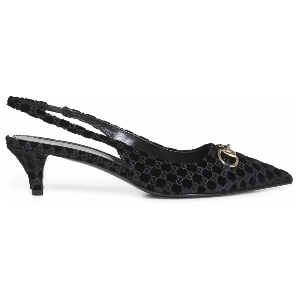 Gucci pumps i GG-velour med en spids tå og signatur Horsebit-detalje, designet til festlige lejligheder og aftenbrug. Vigtigste egenskaber: Sort | Velour | Ankelrem med elastisk indsats | Læderfor og -indersål | Lædersål | Spids tå | Lys guldfarvet metal Horsebit-detalje foran | GG-velouroverdel | Lav GG-velourdækket spolehæl | Mål og pasform: Hælhøjde: 45 mm | Sammensætning og pleje: 69% Viskose | 31% Cupro | Læder