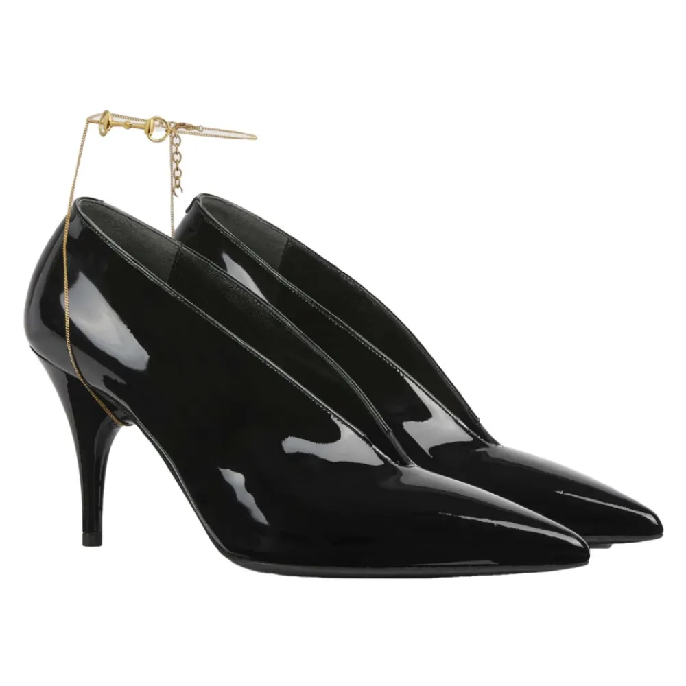 Gucci With Heel har en pumpsilhuet i kalveskindslæder med en aftagelig guldfarvet Horsebit-kæde ved anklen for alsidig styling. Designet til elegante aften- eller festlige lejligheder, og kombinerer klassisk horsebit-hardware med en skulpturel, aflang tå. Vigtige egenskaber: Sort | Kalveskind | Slip-on | Justerbar og aftagelig guldfarvet metalkæde ved anklen | Læderforing og indersål | Lædersål | Aflang tå | Dyb V-udskæring | Guldfarvet Horsebit-detalje | Overdel i laklæder | Hældækket med laklæder | Dimensioner og pasform: Hælhøjde: 85 mm | Sammensætning og pleje: 100% Kalveskind | Læderforing og indersål | Lædersål