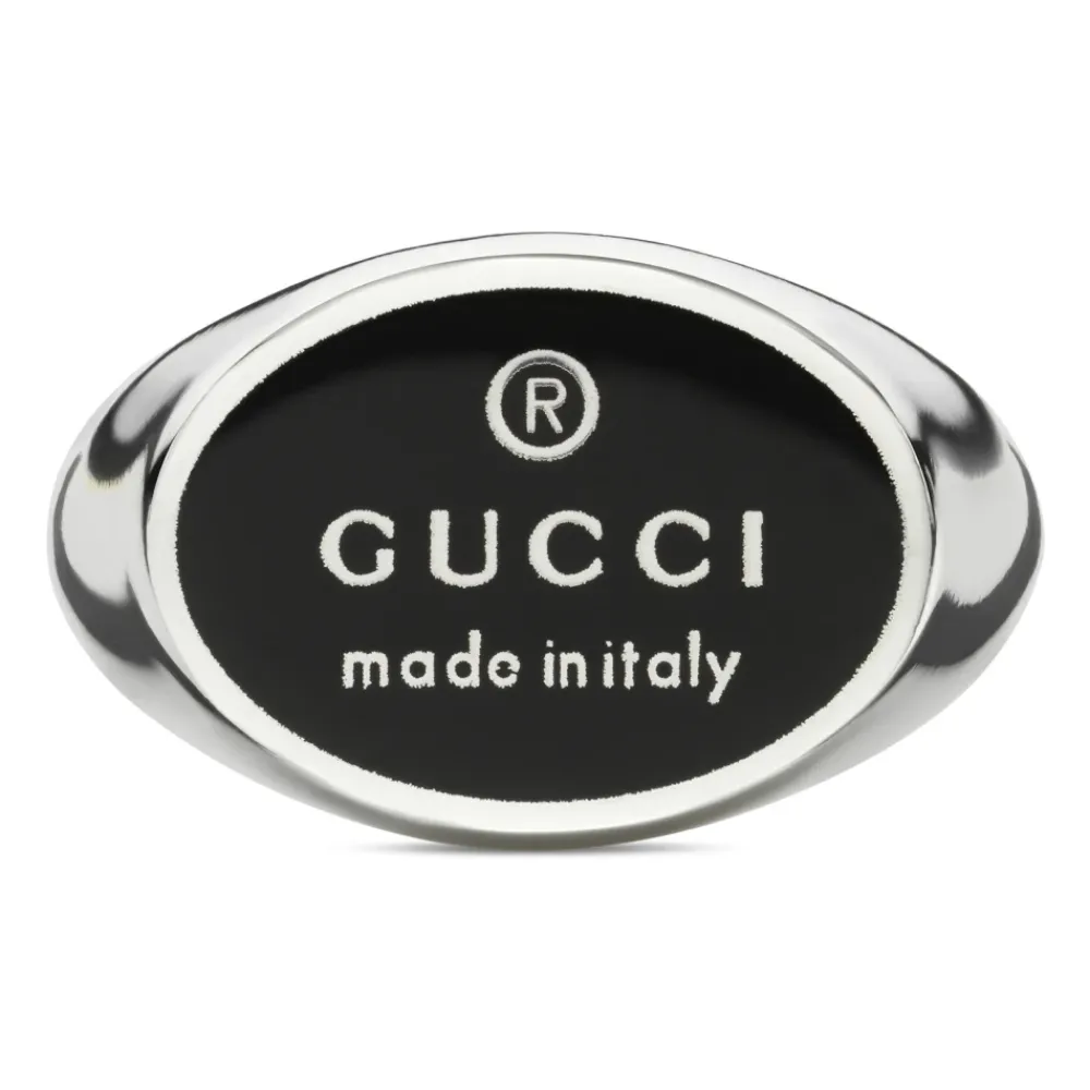 Oplev elegancen fra Gucci med Chevalier Ring, udført i sterlingsølv og med et karakteristisk sort emaljeret ovalt mærke. Denne ring er en perfekt blanding af moderne design og tidløs stil, ideel til at tilføje et strejf af sofistikering til ethvert outfit. Produkt detaljer: Sølv | Grå | Sterlingsølv | Sort emaljeret ovalt mærke | Sammensætning og pleje: 100% Sterlingsølv | Rengør med en blød klud.