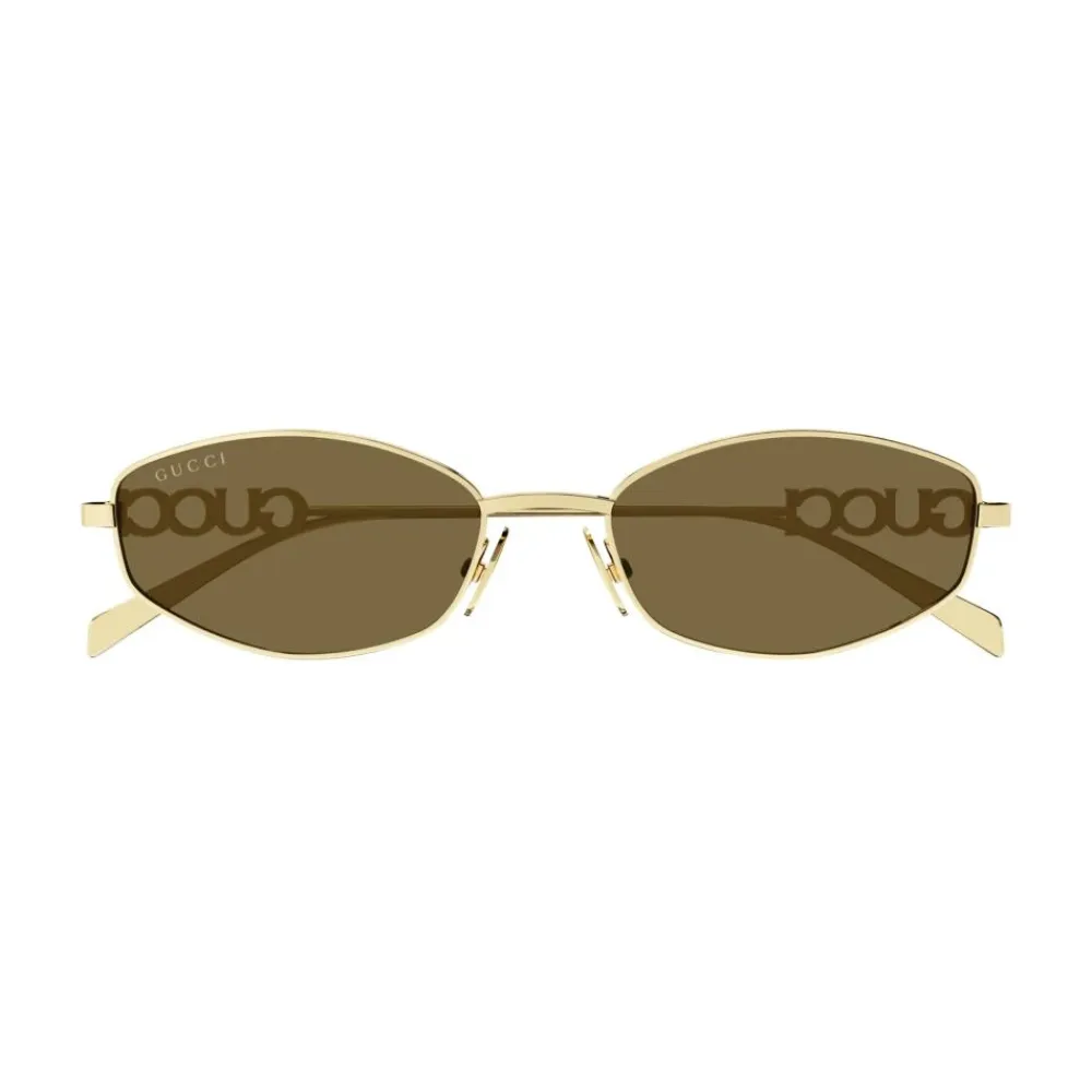 Gucci Oval Frame solbriller kombinerer en slank, guldfarvet metalramme med små ovale tonede glas og det karakteristiske udskårne logo på stængerne for et raffineret, moderne look. Vigtige egenskaber: Gul | Guld | Brun | Metal | 100% UVA/UVB-beskyttelse | Beskyttende hårdt etui medfølger | Designet logo detaljering | Oval ramme | Udskåret Gucci logo på stængerne | Slanke stænger | Små ovale tonede glas | Dimensioner og pasform: Glasbredde: 55 mm | Bro: 18 mm | Stanglængde: 145 mm | Smal pasform | Sammensætning og pleje: Ramme: Metal | Glas: Bio nylon | Opbevares i det medfølgende etui. Rengør med en blød, tør klud; brug om nødvendigt en fugtig klud og mildt rengøringsmiddel. Brug ikke opløsningsmidler (f.eks. alkohol, acetone).