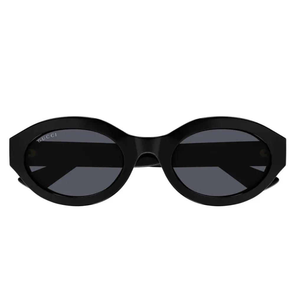 Forhøj din stil med disse sorte Gucci ovalformede solbriller til kvinder. Med en acetatramme, tynde kanter og grå nylonlinser med en guldtone logo på siderne. Giver 100% UV-beskyttelse. Linsebredde: 53 mm; Næsebroens længde: 22 mm; Tempellængde: 140 mm.