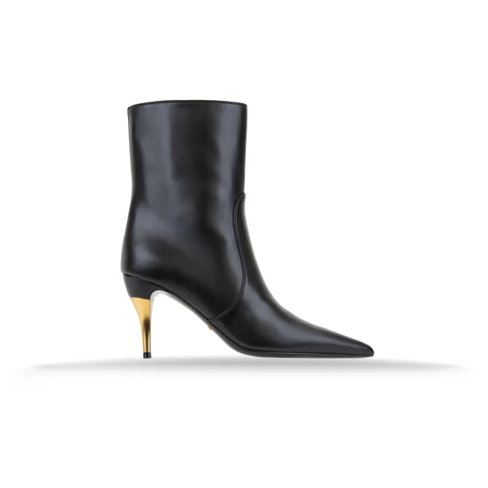 Forhøj din stil med disse Gucci ankelstøvler til kvinder. Fremstillet af luksuriøst læder, har disse spidse ankelstøvler mærkets signatur indersål og en lædersål med guld farvet metal hardware. Komplet med lynlås i siden og en 8,5 cm hæl. Lavet i Italien. Kontakt os for indersålens størrelsesdetaljer!