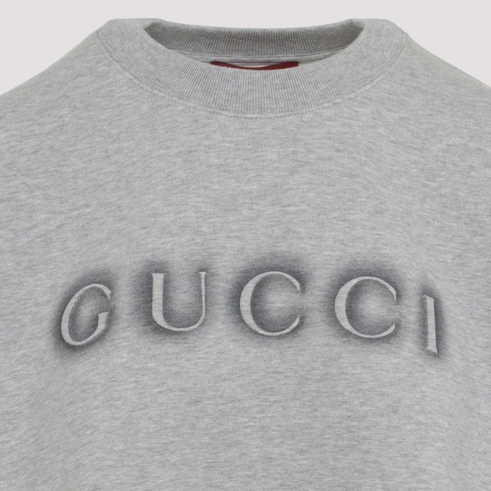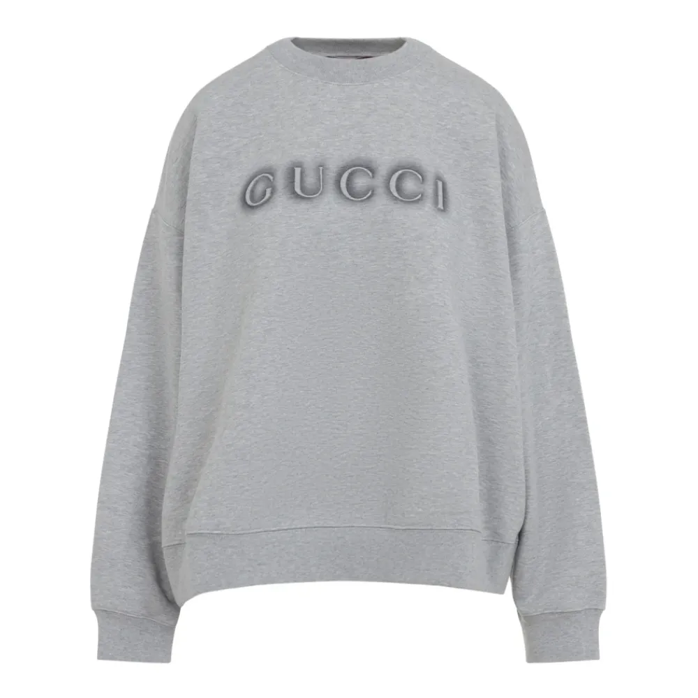 Forkæl dig selv med denne Gucci Grå Bomulds Sweatshirt. Lavet af meleret grå bomuld, med rund halsudskæring, logo på brystet, dropped shoulders, lange ærmer, ribkanter og en afslappet pasform.