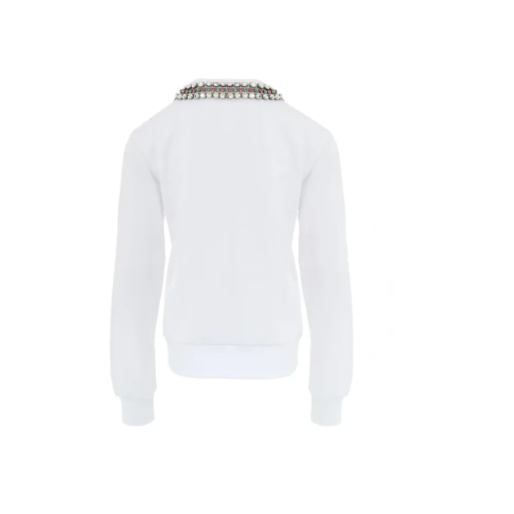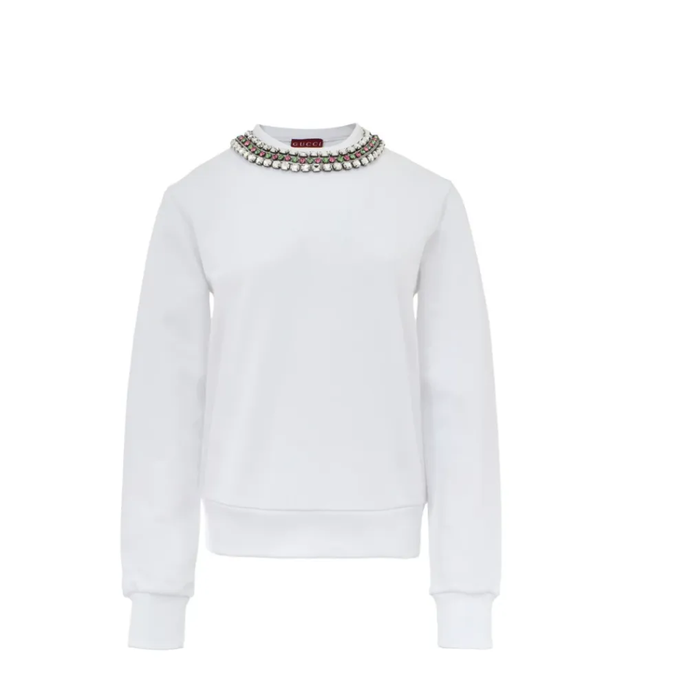 Forkæl dig selv med denne Gucci hvide sweatshirt med juvelhalsudskæring. Med rund hals, lange ærmer og skjult lynlåsåbning på skulderen. Juvelhalsudskæringen med krystalpynt tilføjer et strejf af glamour. Lavet af 100% bomuld. Varenummer: 25GIU208 Brand Varenummer: 791337XJGMT9692.