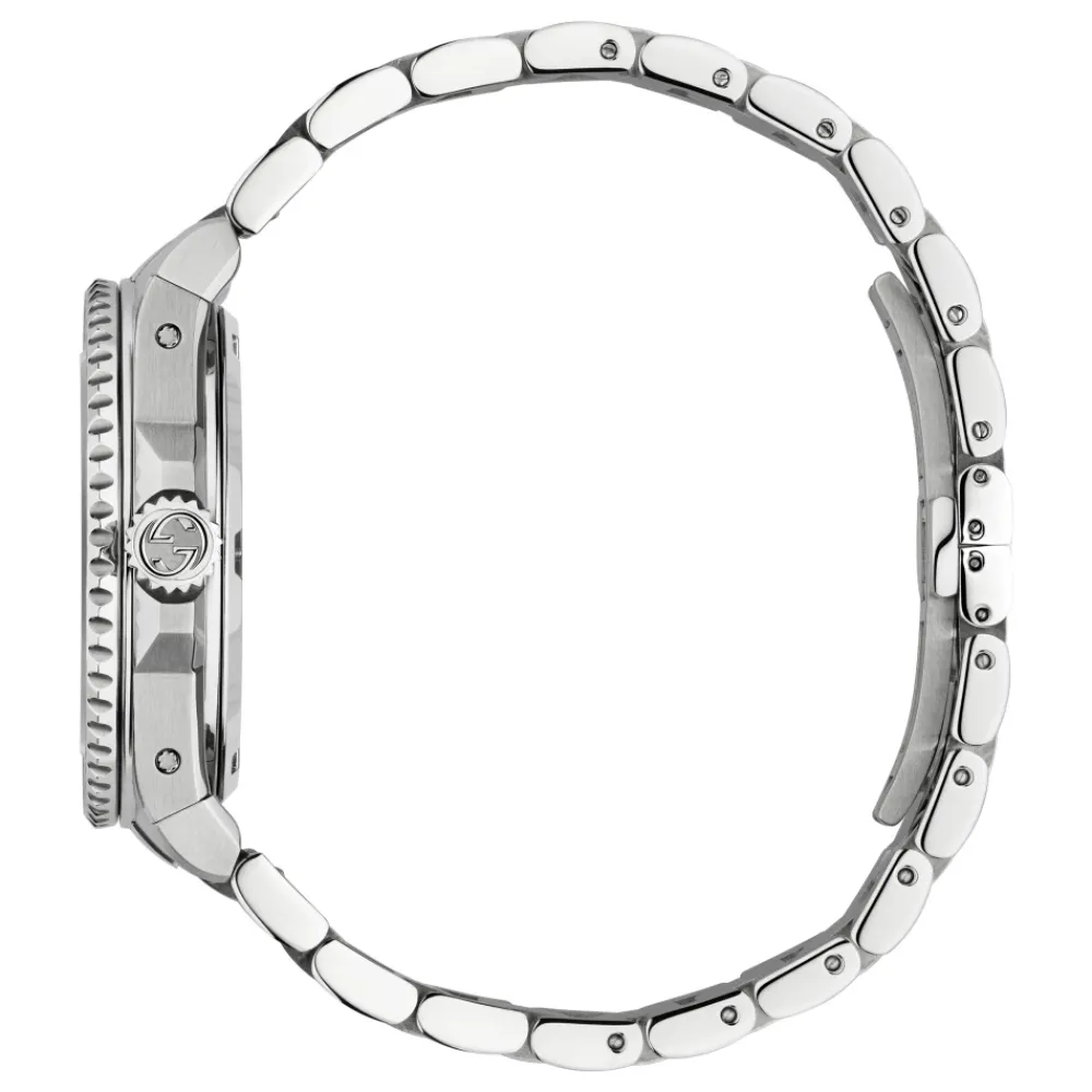 Forhøj din stil med dette Gucci dameur. Med automatisk bevægelse, sølvskive, rustfrit stålkasse, 40 mm diameter, 30 ATM vandtæthed, safirglas, rustfrit stålarmbånd og lås.