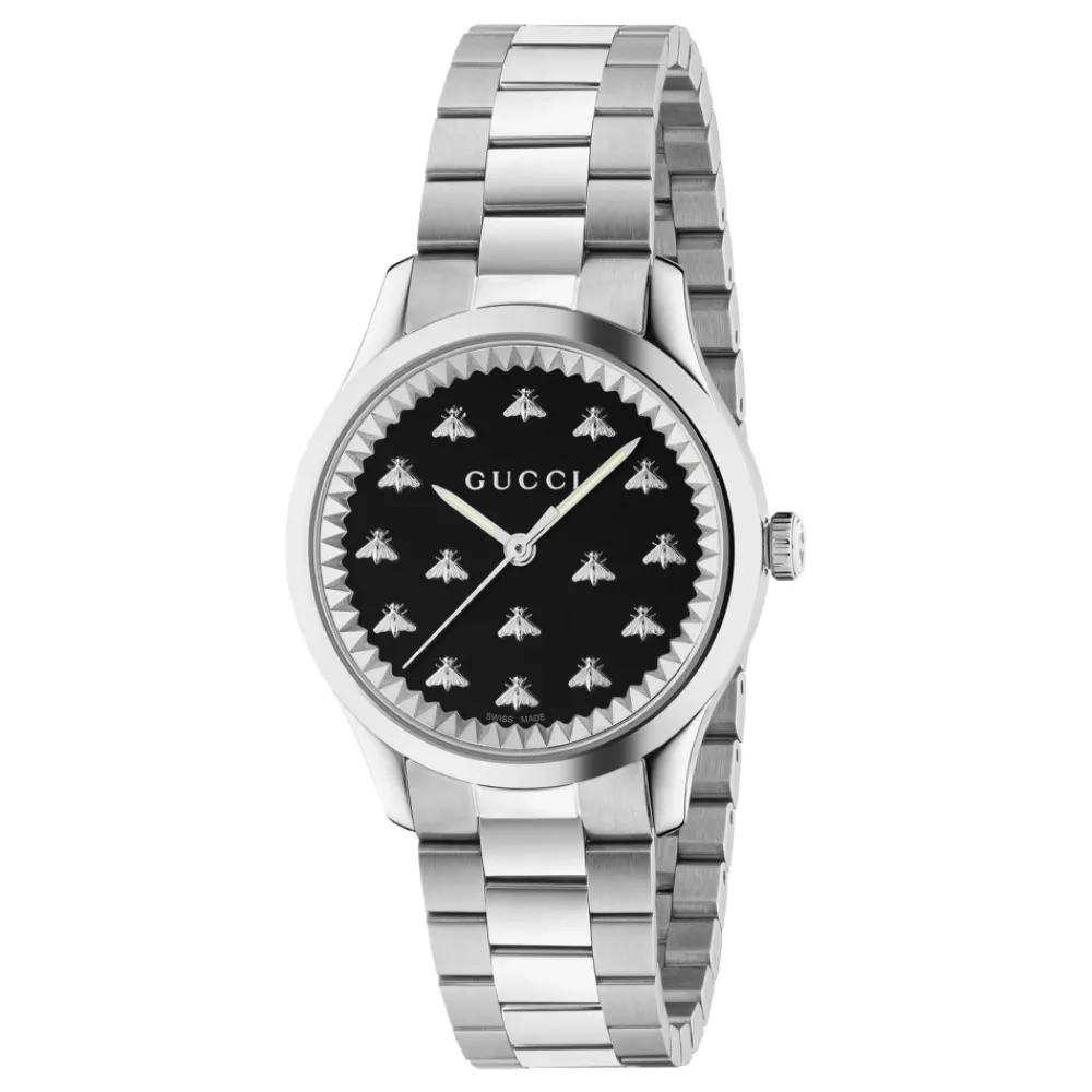 Gucci G-Timeless Watch kombinerer en 32 mm urkasse i rustfrit stål med en sort onyx-skive dekoreret med brandets bi-motiv. Det er et raffineret dressur, der er designet til hverdagsbrug og særlige lejligheder. Nøgleattributter: Sort | Sølv | Rustfrit stål | Vandafvisende til 5 ATM (50 m) | Ridsefast safirkrystal | Quartz urværk | Foldelukning med trykknapudløser | Onyx sort skive med bi-motiv | Rund 32 mm urkasse | Børstet og poleret finish i rustfrit stål | Mål og pasform: Urkassediameter: 32 mm | Sammensætning og pleje: Urkasse i rustfrit stål | Armbånd i rustfrit stål | Safirkrystal | Tør af med en blød klud. Undgå kontakt med kemikalier og ekstreme temperaturer. Betjen ikke kronen under vand. Overhold vandtæthedsgrænsen på 5 ATM, og få pakninger og batteri serviceret med jævne mellemrum.