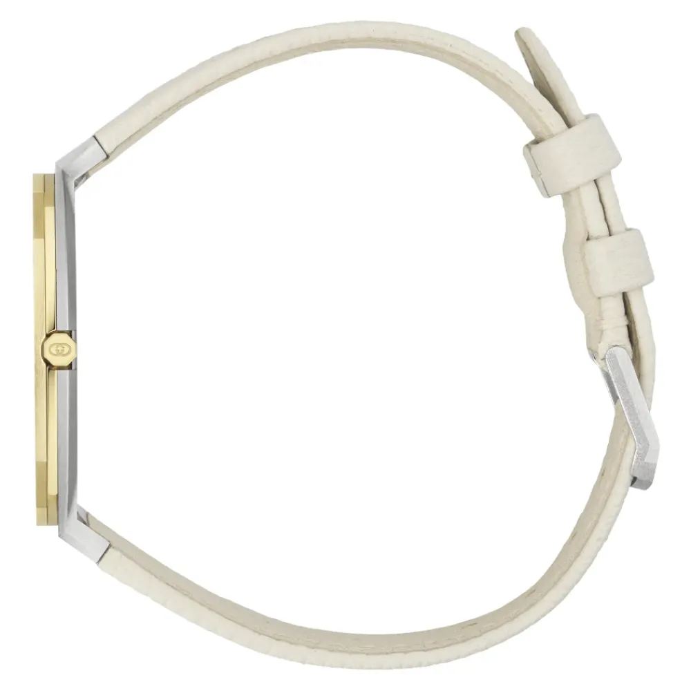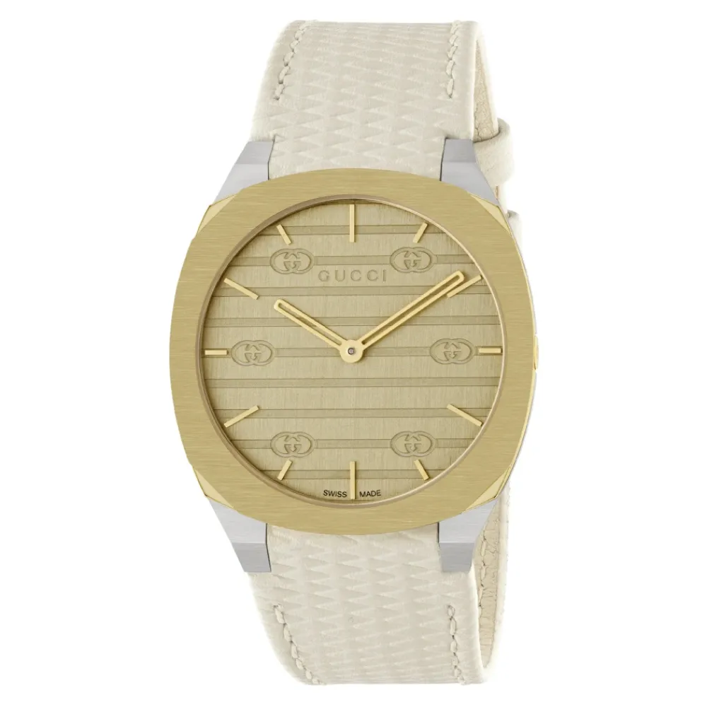 Præsenterer Gucci Dameur, et fantastisk tilbehør der udstråler elegance og stil. Dette kvartsur har en gylden messing urskive og et 34 mm rustfrit stålkabinet for et tidløst udseende. Med en vandtæthed på 3 ATM og safirglas er dette ur både praktisk og holdbart. Det hvide læderrem tilføjer et strejf af sofistikering, mens lukningen af rustfrit stål sikrer en god pasform. Hæv din mode med dette Gucci ur.