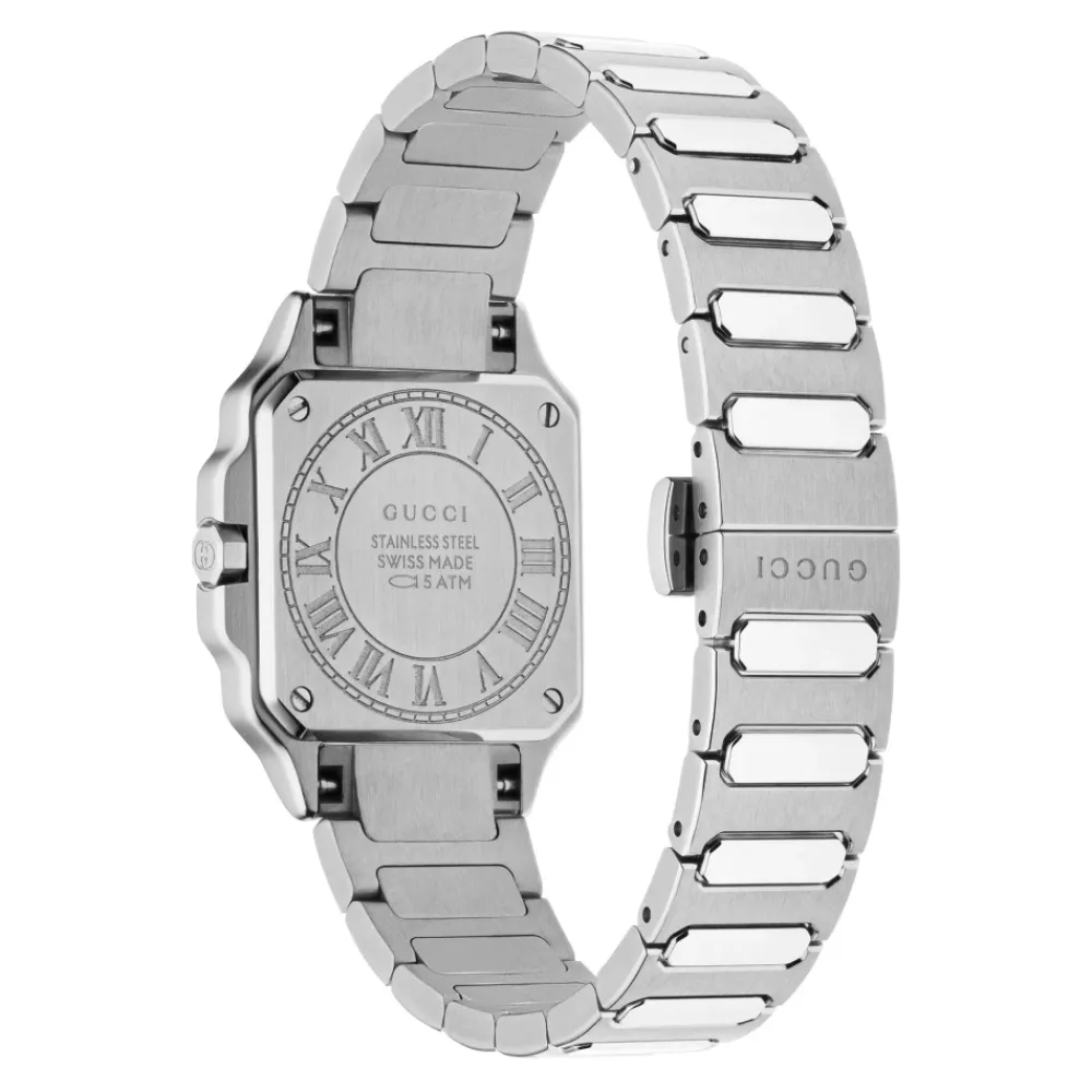 Forhøj din stil med dette Gucci-ur til kvinder. Med en rustfri stålrem og safirglas er dette tilbehør både elegant og holdbart. Vandafvisende op til 5 ATM (50 meter/164 fod).