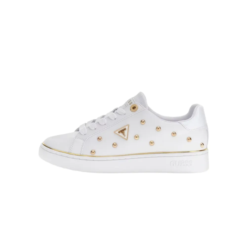 Guess sneakers i imiteret læder med et præget trekantet sidelogo og applikationer med nitter. En statement-klar hverdagssneaker, der passer til både casual og smart-casual outfits. Vigtige egenskaber: Hvid | Bianco | Imiteret læder | Præget trekantet sidelogo | Applikationer med nitter | Overdel i imiteret læder | Sammensætning & pleje: Imiteret læder