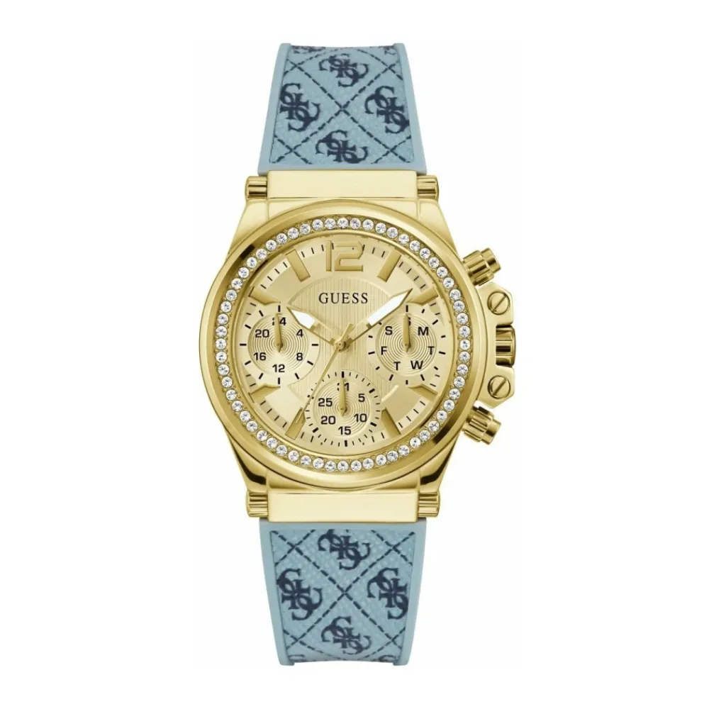 Guess Charisma Multifunktionsur er et analogt multifunktionsur fra Guess, der kombinerer et guldfarvet urkasse med en mønstret lyseblå rem til hverdagsbrug. Vigtige egenskaber: Gul | Guld | Lyseblå | Rustfrit stål | Vandafvisende (producentens påstand) | Quartz urværk | Mineralglas | Multifunktions analog display | Analog tidsvisning | Guldfarvet urkasse | Lyseblå mønstret rem | Sammensætning & pleje: Rustfrit stål | Mineralglas | Quartz urværk | Silikone | Gummi