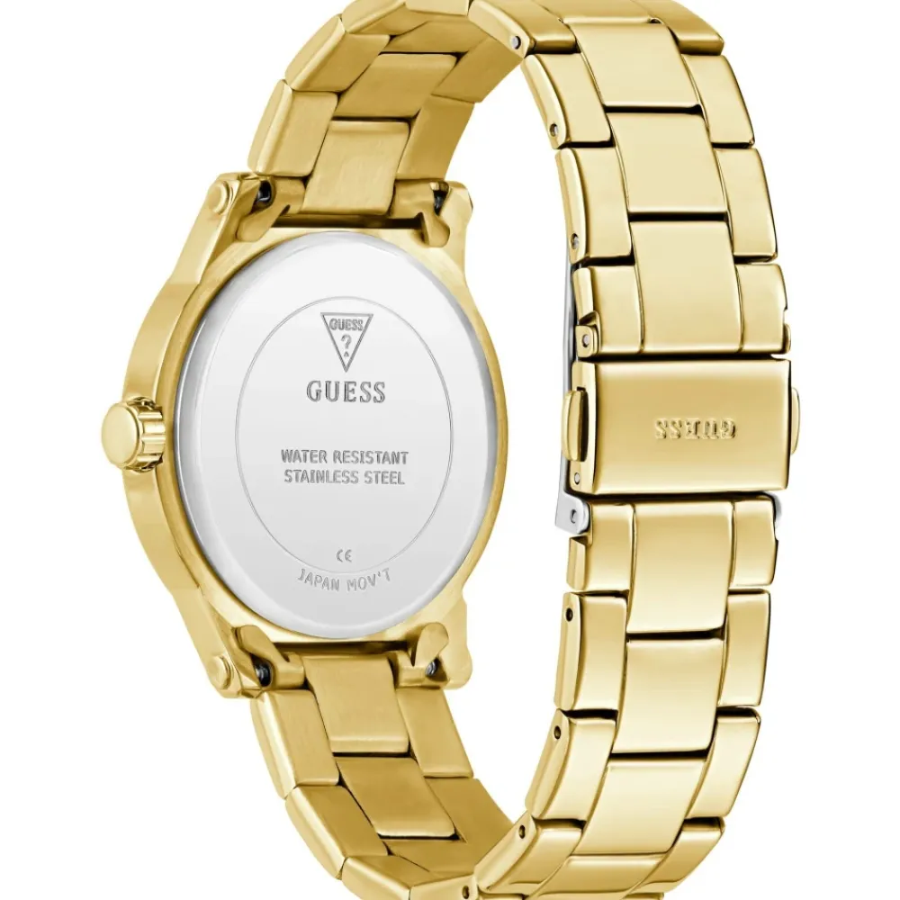 Guess GW0861L2 Watch kombinerer en guldfarvet urkasse og armbånd i rustfrit stål med en krystalbesat urkrans og en diskret mønstret guldfarvet urskive for et raffineret, kontorklart look. Nøgleattributter: Gul | Guld | Rustfrit stål | Quartz urværk | Stænktæt | Mineralglas | Armbånd i rustfrit stål | Guldfarvet mønstret urskive | Krystalbesat urkrans | Sammensætning & pleje: Rustfrit stål | Mineralglas | Krystaller | Aftørres med en blød klud; undgå længerevarende vandeksponering; må ikke nedsænkes.