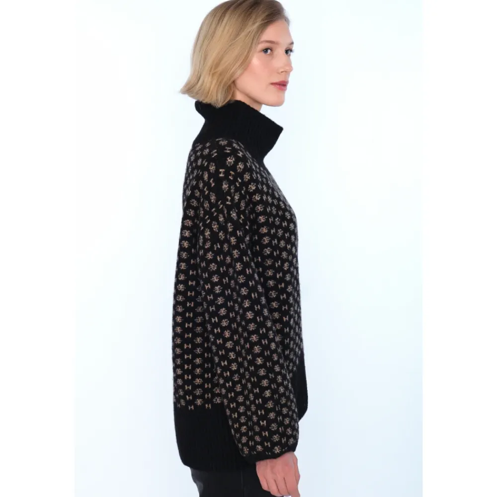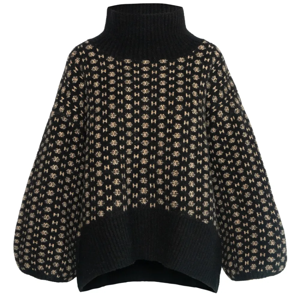 HÉST Logo Sweater er en strikket trøje med høj hals, der defineres af et markant all-over H-logo. Den kortere front og længere ryg skaber en moderne silhuet, der er ideel til lag-på-lag. Vigtige egenskaber: Sort | Uld | Høj halsudskæring | All-over H-logomønster | Kortere front, længere ryg | Oversized silhuet | Dropped shoulders | Voluminøse ærmer | Ribkant | Mål & pasform: Størrelse 1 — Længde bag: 56 cm, Længde foran: 46 cm, Ærmelængde: 61 cm, Bredde: 60 cm | Størrelse 2 — Længde bag: 66 cm, Længde foran: 56 cm, Ærmelængde: 65 cm, Bredde: 70 cm | Oversized pasform | Dropped shoulders | Kortere front, længere ryg (high-low hem) | Sammensætning & pleje: 30% uld | 15% alpaca | 30% akryl | 22% nylon | 3% elastan | Håndvask eller maskinvask på uldprogram. Må ikke stryges.