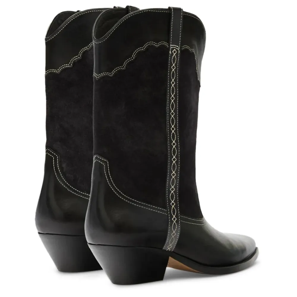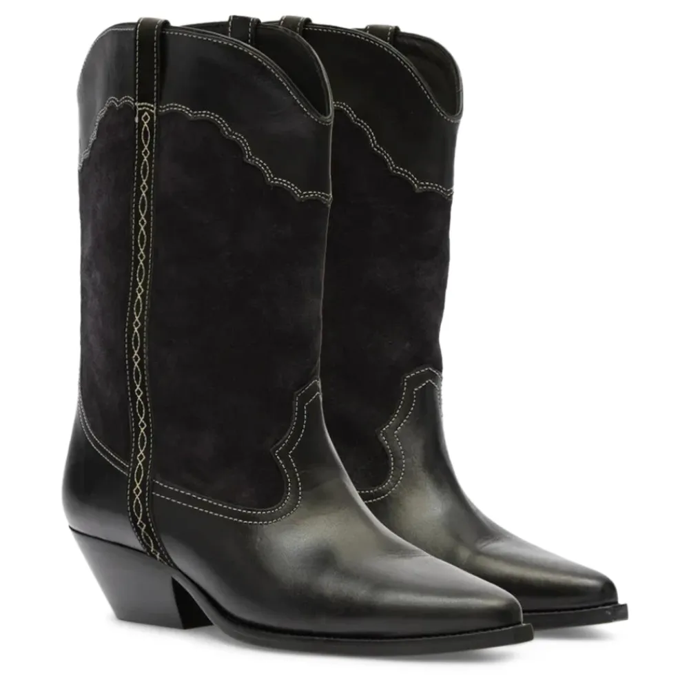 Isabel Marant Duerto Boots er western-inspirerede cowboy støvler i ruskind og kalveskind med en spids snude og lamineret cubansk hæl for et raffineret hverdagslook. Nøgleattributter: Sort | Ruskind af kalveskind og okselæder | Blødt læderfor | Komfortfokuseret læder indersål | Høje overdele | Strop i siden | Bløde læderindersåler og -ydersåler | Spids snude | Runde åg | Kontrasterende topstikninger i broderistil | Lamineret cubansk hæl | Mål og pasform: Hælhøjde: 4,5 cm. | Små i størrelsen – overvej at gå en størrelse op. | Sammensætning og pleje: 60% ruskind af kalveskind, 40% okselæder.