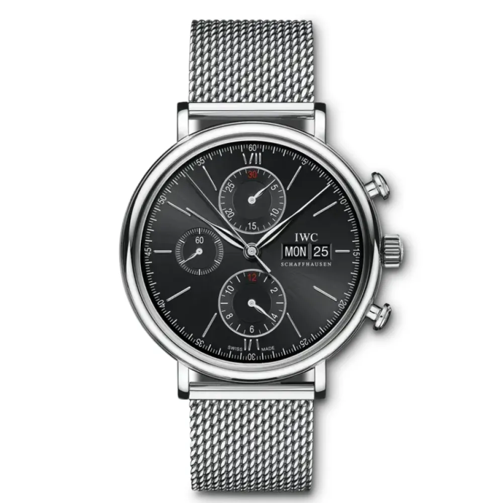 IWC Schaffhausen Portofino Chronograph kombinerer et 42 mm automatisk kronografværk med en raffineret Milanaise mesh-lænke, hvilket giver et elegant ur, der er klar til hverdagsbrug. Den sorte urskive og det klassiske kronograflayout gør det ideelt til formelt og professionelt brug. Nøgleattributter: Sort | Sølv | Rustfrit stål | Vandtæthed 3 bar | Safirkrystal | Gangreserve 44 timer | Kronograf (timer, minutter, sekunder) | Dag- og datovisning | Automatisk optræksværk | Milanaise mesh-lænke i rustfrit stål | Milanaise mesh-lænke | Konveks safirkrystal med antirefleksbelægning | Påførte indeksmarkeringer | Kronograf-trykknapper | Dimensioner & pasform: Urkassediameter: 42 mm | Urkassehøjde: 13,6 mm | Rembredde: 20 mm | Sammensætning og pleje: Urkasse i rustfrit stål | Lænke i rustfrit stål (Milanaise mesh) | Safirkrystal | Aftørres med en blød klud; undgå kontakt med kemikalier og ekstreme temperaturer; få uret serviceret af en autoriseret forhandler.