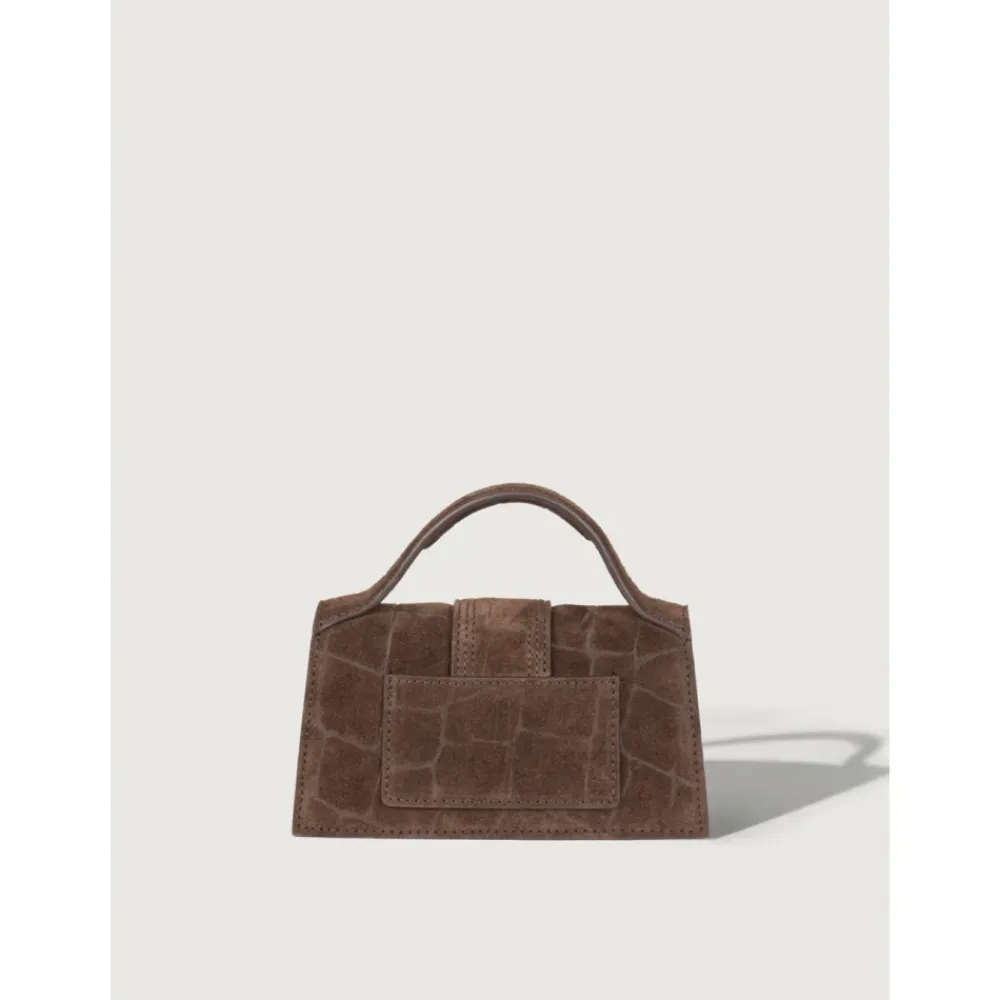 Jacquemus The Bambino er en kompakt mini taske med flap, udført i krokodille-præget kalveskind. Det polstrede tophåndtag og den aftagelige lange rem gør den til en alsidig læder crossbody eller lille tophåndtaske til hverdagens nødvendigheder. Vigtige egenskaber: Mørkebrun | Kalveskind | Struktureret form | Magnetisk flaplukning | Aftagelig og justerbar lang rem | Polstret tophåndtag | Patchlomme på bagsiden | Fuldt foret med bomuld | Krokodilleprægning | Topstitched detaljer | Farvede kanter | Sølv metal logo og hardware | Dimensioner og pasform: 17,5 cm x 9 cm | Sammensætning og pleje: 100% Kalveskind | Foring: 100% Bomuld | Undgå kontakt med vand, kosmetik og varme. Undgå langvarig udsættelse for sollys. Opbevar i støvposen på et tørt sted.
