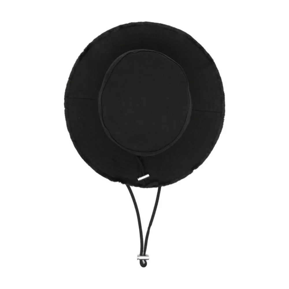 Fremhæv din stil med denne sorte Jacquemus hat med frynset kant, flad krone, snørelukning og logo-tekst. Kanten måler 7,5 centimeter med en omkreds på 58,0 centimeter. Perfekt til den modebevidste kvinde.