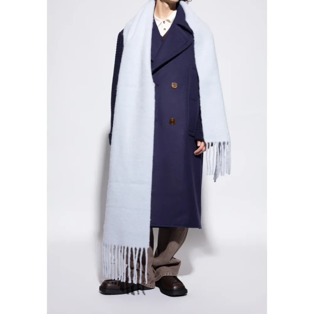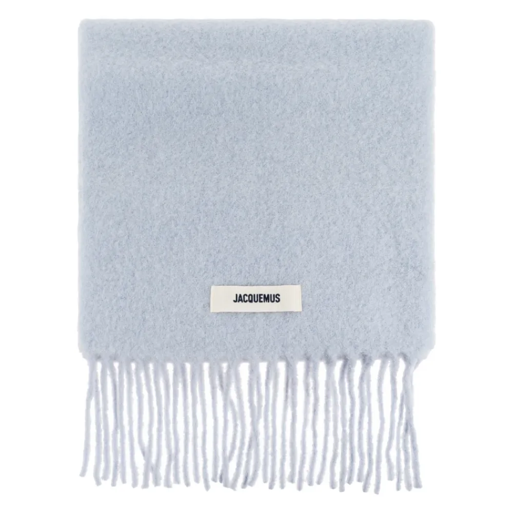 Jacquemus Carro Scarf er et bredt, rektangulært vintertørklæde fra Jacquemus, afsluttet med et markant logo-mærke og lange frynser. Dens lyseblå tone og bløde mohair-alpaca blanding gør det til et minimalistisk statement-stykke til sæsonbestemt lagdeling. Vigtige egenskaber: Blå | Lyseblå | Mohair, alpaca, uld, polyamid | Rektangulær form med bredt snit | Lange, tykke frynser | Hvidt rektangulært logo-mærke | Ensartet, glat overflade | Minimalistisk design | Dimensioner og pasform: 40 cm x 250 cm | One size | Sammensætning og pleje: 28% mohair | 28% alpaca | 24% jomfruuld | 20% polyamid