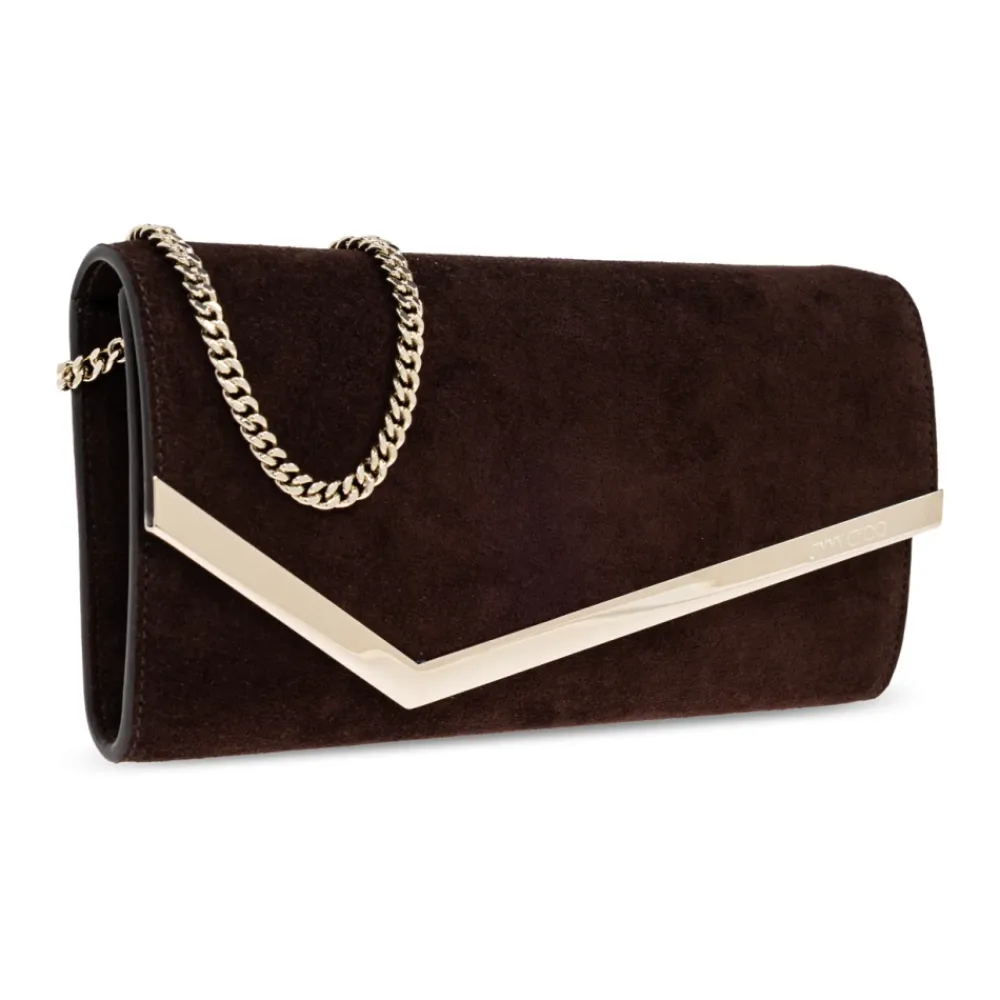 Jimmy Choo Emmie Clutch kombinerer en struktureret rektangulær silhuet med en geometrisk guldspænde for et elegant aftenlook. Dens kompakte form og kæderem gør den til en alsidig accent til formelle lejligheder. Nøgleattributter: Chokolade | Lyst guld | Ruskind | Fin guldkæde til hånd- eller skulderbæring | Magnetisk eller trykknaplukning | Indvendige kortlommer og lynlåslomme | Rektangulær, struktureret form | Asymmetrisk flap med subtile geometriske linjer | Geometrisk guldspænde graveret med JIMMY CHOO | Ruskindstekstur | Mål og pasform: Højde: 12 cm | Bredde: 22 cm | Dybde: 3 cm