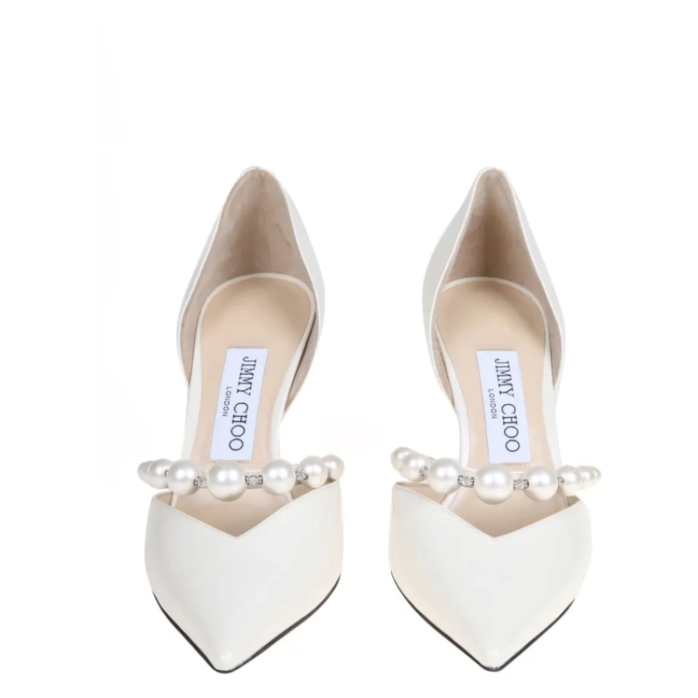 Jimmy Choo Aurelie 85 Pumps er spidse pumps i patentlæder, afsluttet med perle- og krystaludsmykning, designet til festlige lejligheder og brudelook. Vigtigste egenskaber: Latte | Hvid | Patentlæder | Rem med påsatte perler og krystaller | Åbne sider | Spids tå | Perle- og krystaludsmykning | Åbne sider | Dimensioner og pasform: Hælhøjde 8,5 cm | Sammensætning og pleje: Overdel: Patentlæder (kalvelæder) | Foring: Læder | Sål: Læder | Trim: Krystaller, imiterede perler