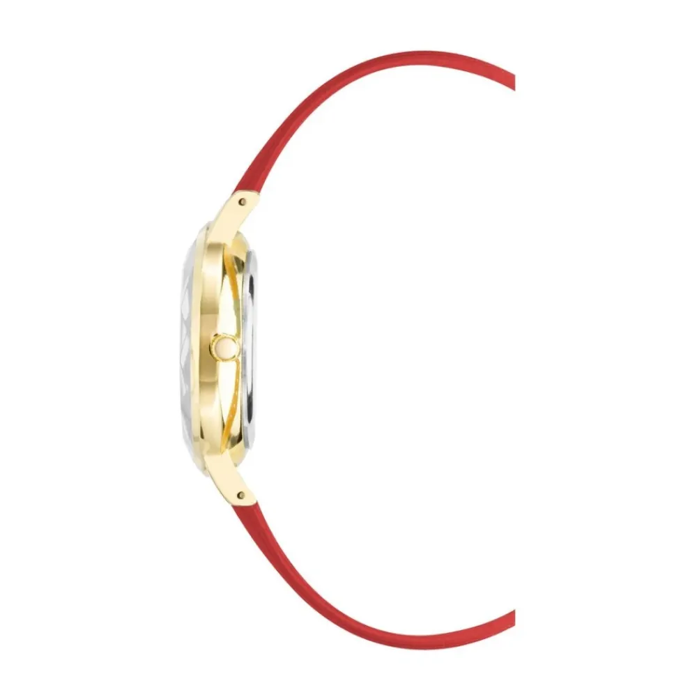 Forkæl dig selv med dette Juicy Couture dameur. Uret har en kvarts mekanisme, analog visning, et METAL urkasse i en smuk GULD farve og en livlig RØD POLYURETHANE rem. Skiven og remmen matcher i en modig rød farve, suppleret med MINERAL glas og en spænde lukning. Vandafvisende design med en 34 MM skivediameter. Perfekt til at tilføje et strejf af farve til dit outfit.