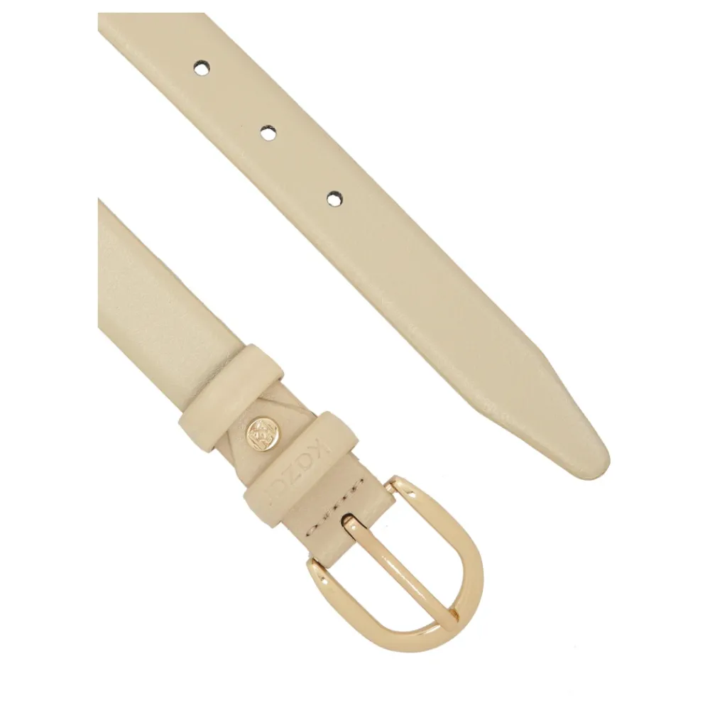 Den minimalistiske bælte er et elegant og alsidigt tilbehør, ideelt til mange outfits. Lavet af naturligt læder i en alsidig flødefarve, blander den sig perfekt med forskellige farvepaletter, hvilket giver letthed og naturligt udtryk til styling. Bæltet er udstyret med en lille guldspænde, som med sin delikate glans tilføjer et sofistikeret præg til det hele. Den præsenterede model er et ideelt valg for dem, der værdsætter enkelhed, tidløs stil og subtile, elegante tilbehør. Bæltet har 5 huller, afstanden mellem hullerne er 2 cm. Bæltet har også en funktion til individuel længdejustering, takket være muligheden for at forkorte det ved spændet.