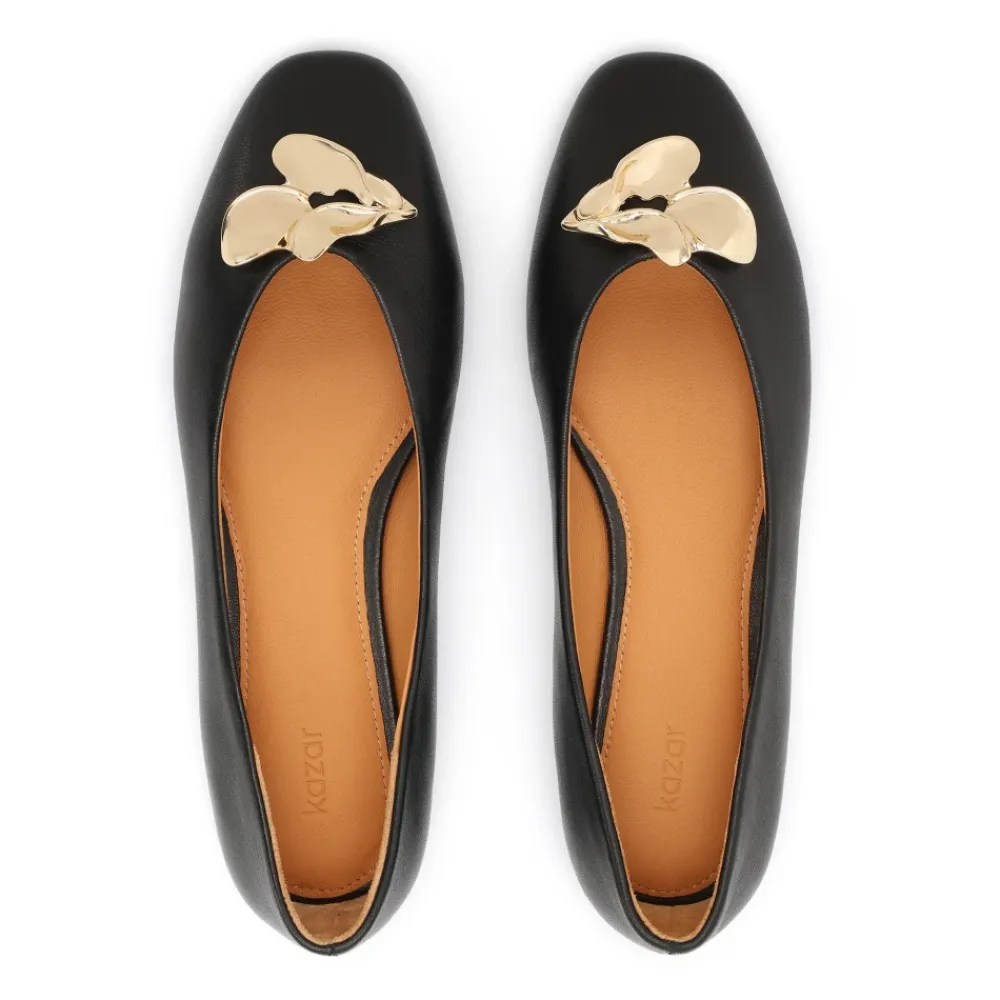 Kazar SUZENA Ballerinaer kombinerer en overdel i glat narvlæder med en markant guldbroche for et elegant, byklar look. Designet til hverdagsbrug, kombinerer de raffinerede detaljer med en lav, komfortabel sål. Nøgleattributter: Sort | Narvlæder | Foring i fårelæder | Slip-on konstruktion | Tunit-sål | Gulddekorativ broche | Overdel i glat læder | Lav flad sål | Dimensioner & pasform: Fodlængdereference: 22,5 cm (EU 35) – 27 cm (EU 42) | Følg EU-størrelser; tillad cirka 0,5–1 cm ekstra for komfort. | Størrelsesguide tilgængelig for EU 35–42 med tilsvarende fodlængder. | Sammensætning & pleje: Narvlæder (overdel) | Fårelæder (foring) | Tunit (sål) | Tørres af med en fugtig klud for let rengøring. Brug en mild læderrens eller læderskum til kraftigere pletter, og påfør derefter en lille mængde skocreme i matchende farve. Må ikke maskinvaskes.