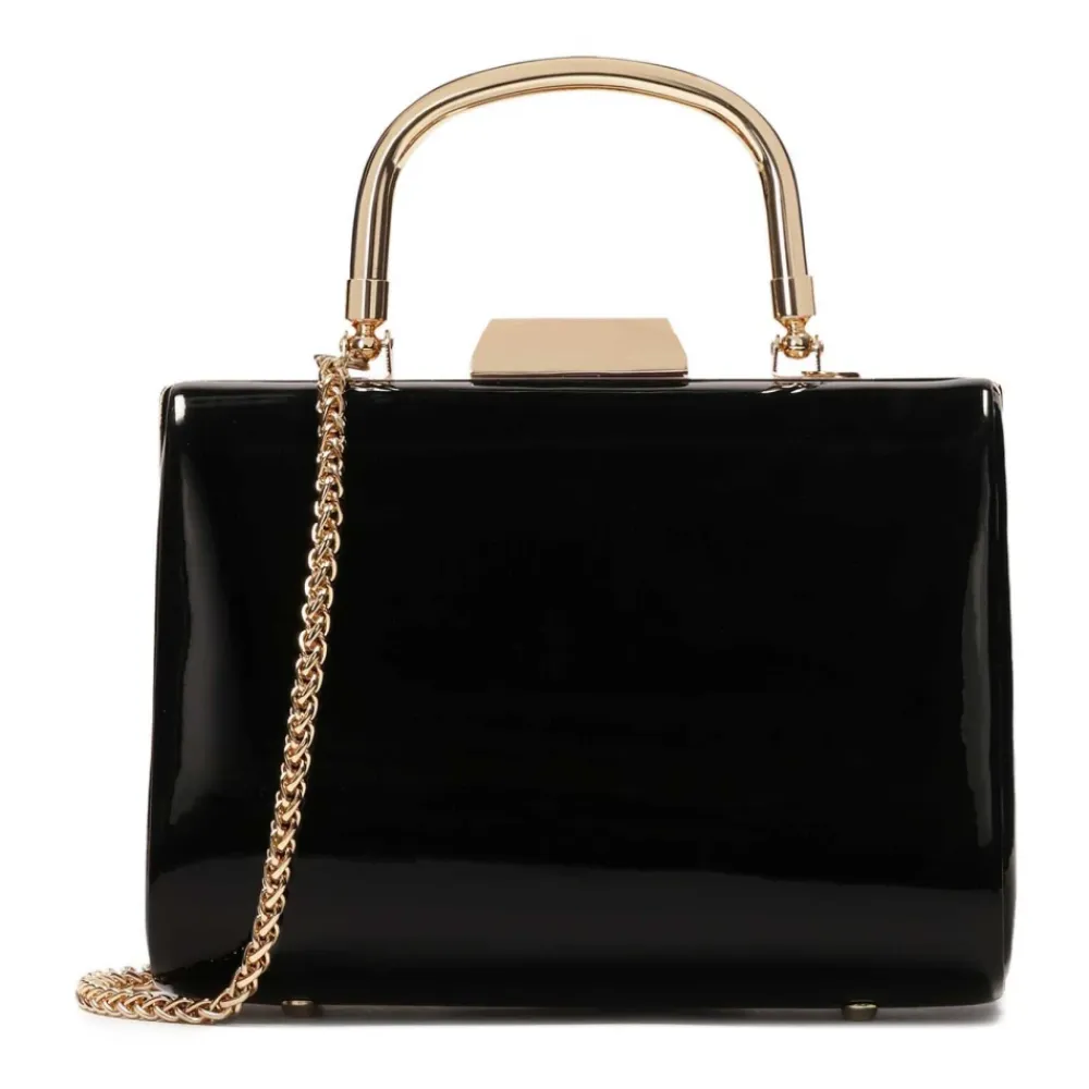 Sort aftenclutch taske lavet af laklæder er et elegant og karakteristisk tilbehør, der udstråler luksus og moderne stil. Dens stive design i form af en boks giver den geometrisk perfektion, mens det blanke overflade af læder tilføjer en slående glans, der passer perfekt til aftenlooks. Den dybe sorte farve i en lakeret finish fremhæver dens sofistikerede karakter og gør den til et alsidigt men eksklusivt valg. Et metalbærehåndtag, tilgængeligt i sølv eller guld tone, tilføjer subtil elegance og funktionalitet. Fødderne på bunden af tasken beskytter den mod ridser og snavs og understreger opmærksomheden på detaljer. Denne clutch taske er det perfekte supplement til aftenoutfits og tilbyder en kombination af klassikere med et moderne finish. Produkt detaljer: Hovedrum med trykknaplukning. Indvendigt 2 åbne og 1 lynlåsrum. Indvendigt rum 1 åben lomme. Metal fødder på bunden af tasken.