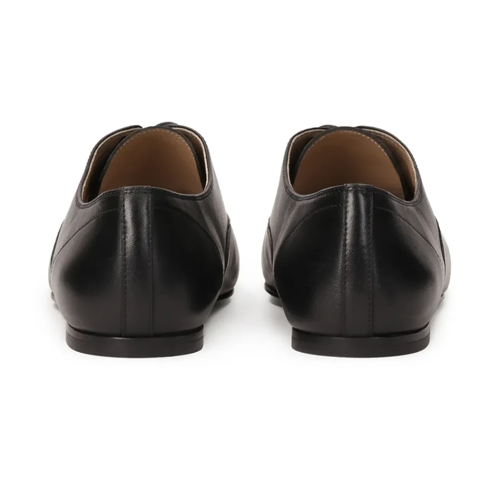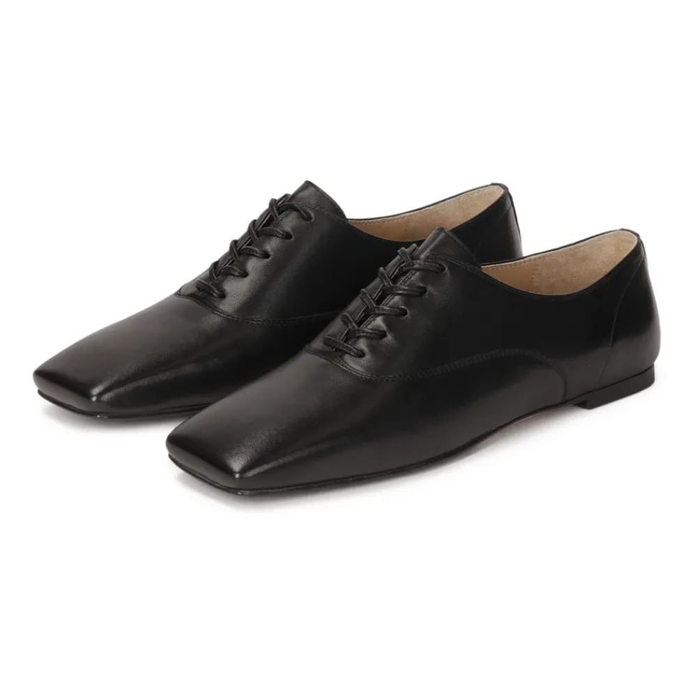Klassisk præcision møder moderne minimalisme i disse sofistikerede halvsko, fremstillet af premium naturlæder i en dyb sort farve. Deres lave, snørede overdel med perfekt raffinerede linjer understreger subtilt foden slankhed, og kombinerer tidløs elegance med funktionalitet. Den firkantede tå tilføjer et arkitektonisk touch til modellen og introducerer en sofistikeret kontrast mellem det klassiske snit og moderne detaljer. Dette er et forslag til kvinder, der værdsætter diskret luksus og fint skræddersyet design, som fungerer godt både i formel styling og i hverdagens elegante fremtræden. Lædersålen med gummisål kombinerer den elegante æstetik og naturligheden af læder med den exceptionelle greb og holdbarhed af gummi, og tilbyder den perfekte kombination af komfort, sikkerhed og stil. Den semianilin-fåreskindforing, med dens fremragende fugtabsorberende egenskaber, giver enestående komfort.