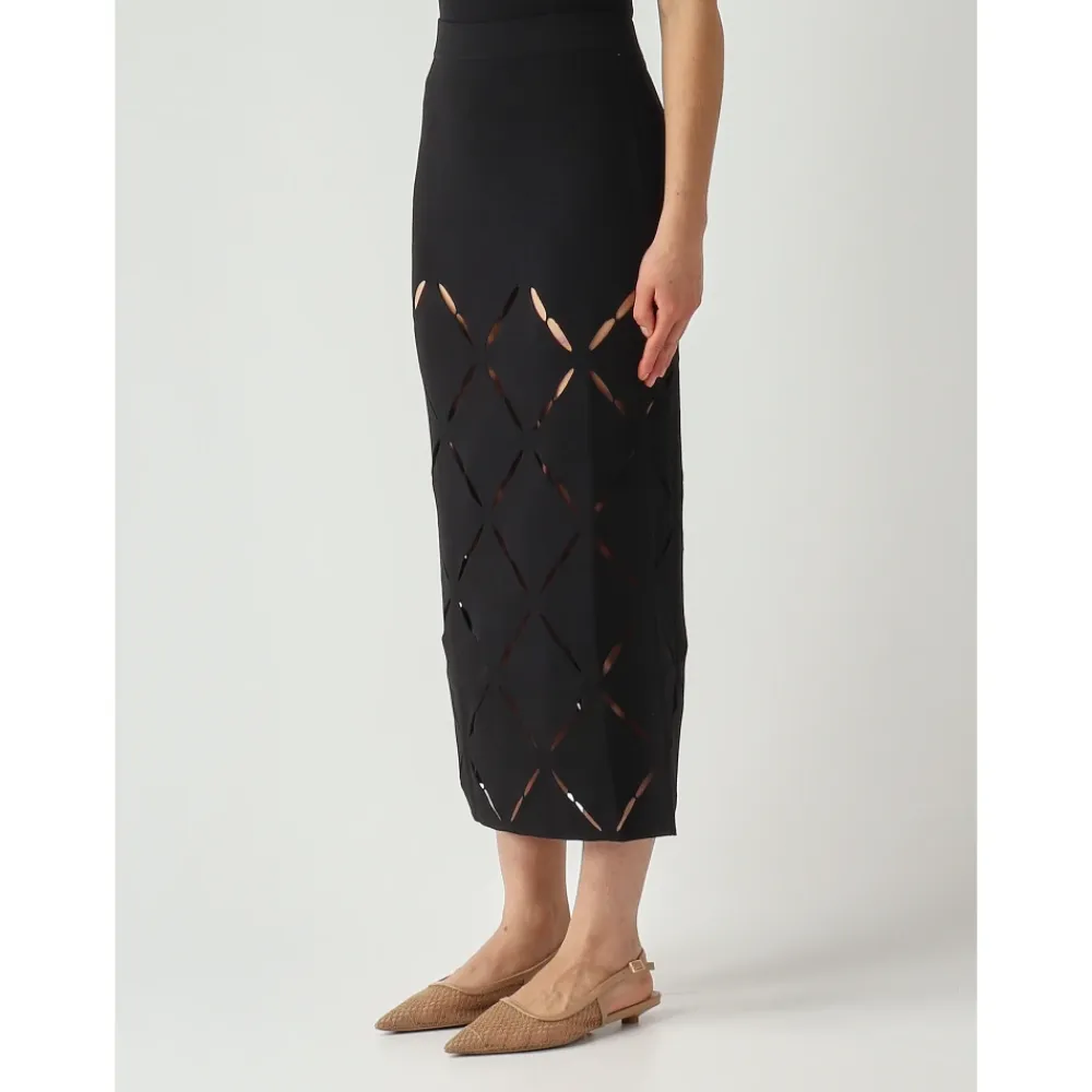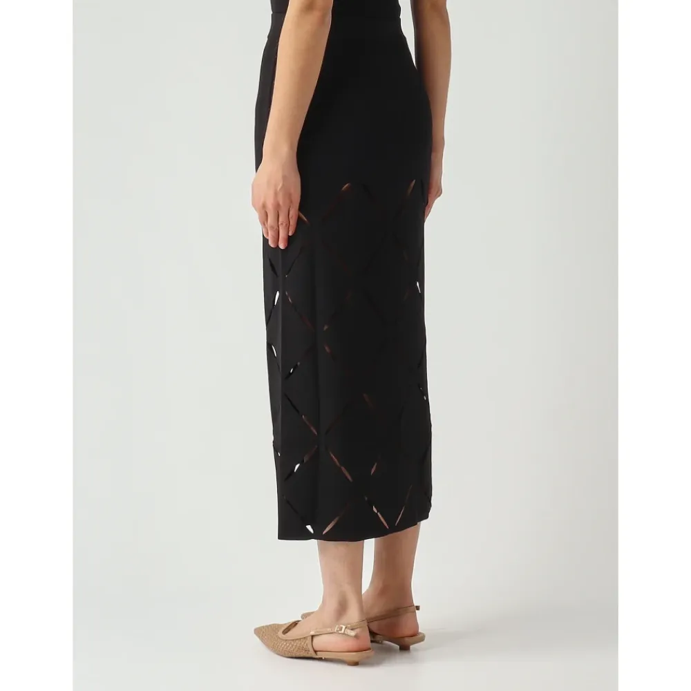 Liviana Conti Peggy Skirt har udskårne detaljer og en midi pencil silhuet, designet til elegante hverdags- eller aftenlooks. Vigtige egenskaber: Sort | Nero | Viskose | Strækstof | Elastisk taljebånd | Udskårne detaljer | Gennembrudt mønster | Midi pencil silhuet | Delvis gennemsigtig effekt | Dimensioner & pasform: Regular fit | Høj talje | Midi længde | Sammensætning & pleje: 65% Viskose, 35% Polyamid