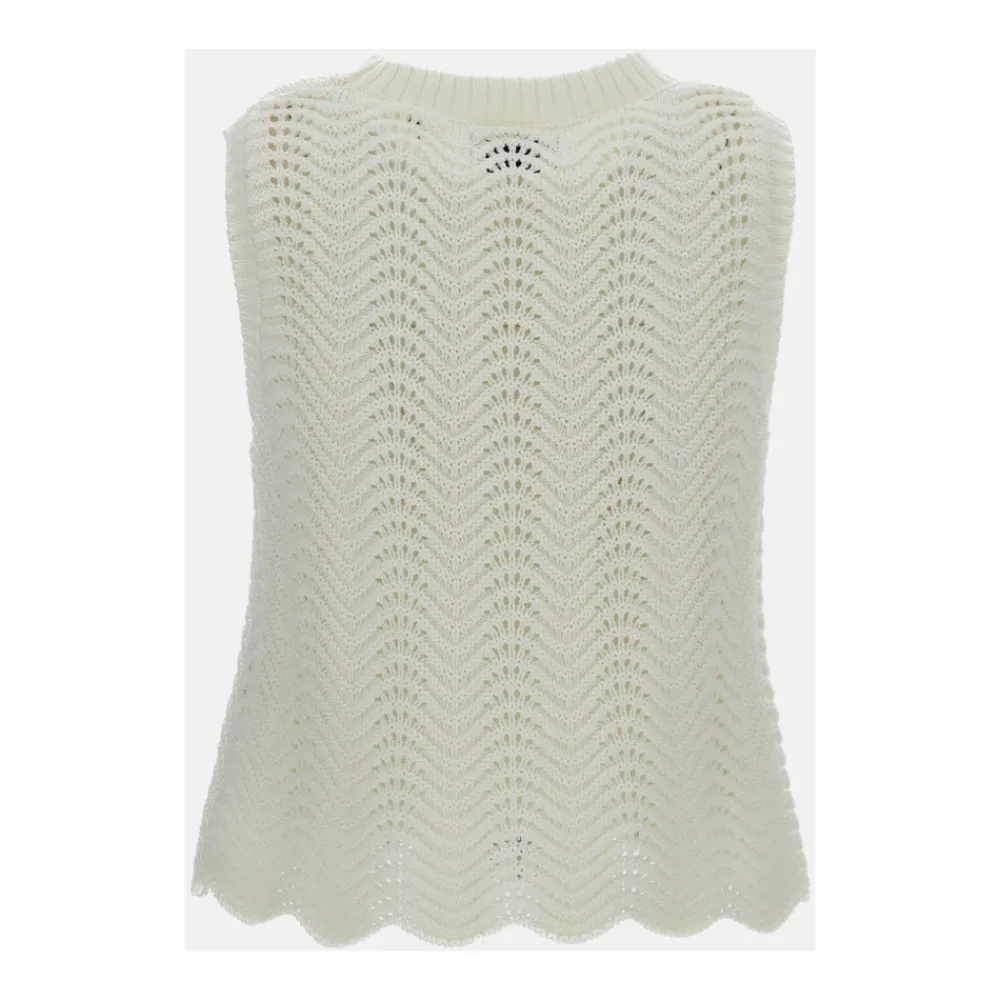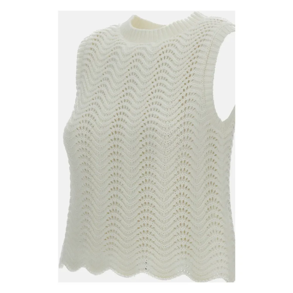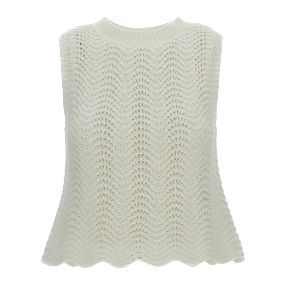 Loulou Studio VITTORIAIVORY er en ærmeløs, hæklet Ottoman-strikket top med en bådudskæring. Den er designet til en lige pasform og fungerer godt lagdelt eller båret alene til varme vejrlooks. Vigtige egenskaber: Hvid | Hæklet strik | Bådudskæring | Ærmeløs | Ribkant | Ottoman-hæklet tekstur | Mål og pasform: Lige pasform