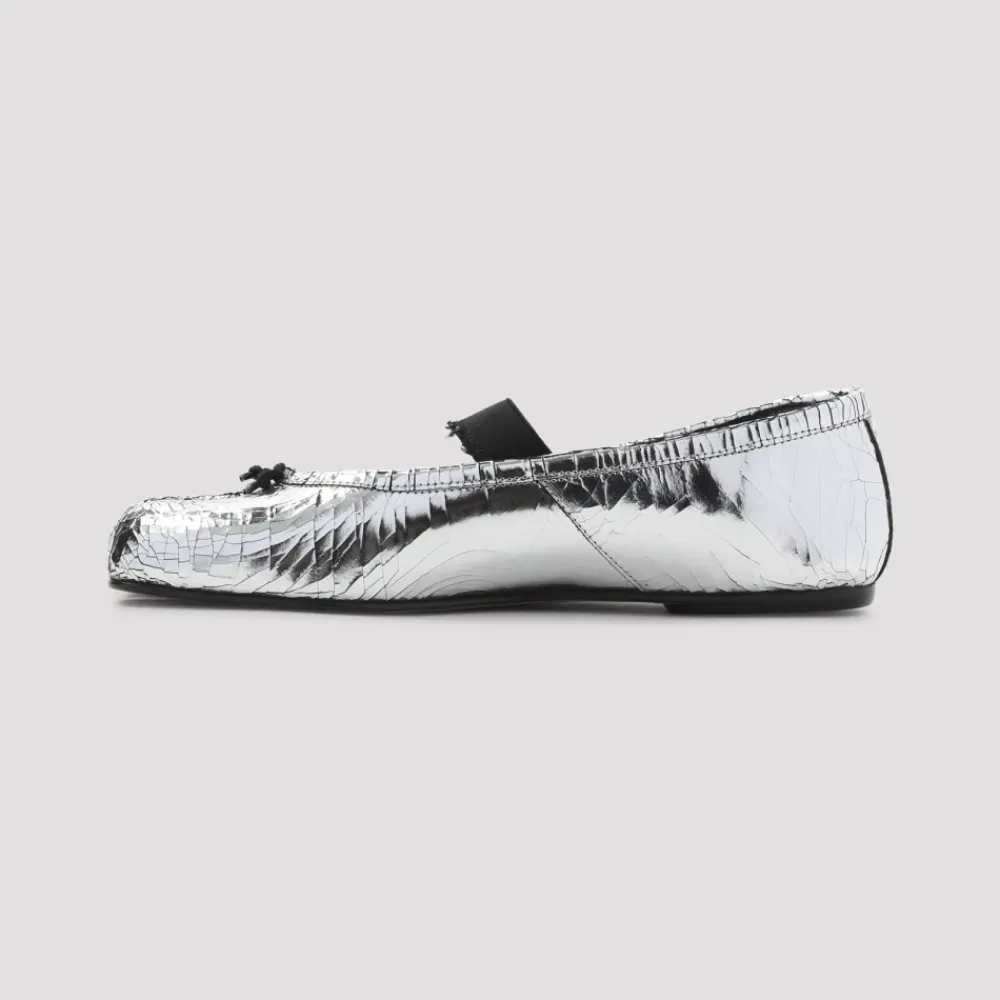 Maison Margiela Tabi Ballerina kombinerer husets signatur silhuet med split-tå med en højglans metallisk finish og skaber en skulpturel flad sko, der nemt kan bruges fra dag til aften. Vigtigste egenskaber: Sølv | Sort | Læder | Slip-on stil | Elastisk rem over vristen for sikker pasform | Tabi split-tå | Krakeleret metallisk tekstureret overdel | Kontrasterende sort knudedetalje ved tåen | Kontrasterende sort elastisk rem over vristen | Flad lædersål | Hvid stikningsdetalje ved hælen | Style kode: S39WZ0113-P7456-H7730 | Sammensætning & pleje: Overdel: 100% kalveskind | Foring: 100% ovine (fåreskind) læder | Sål: 100% kalveskind