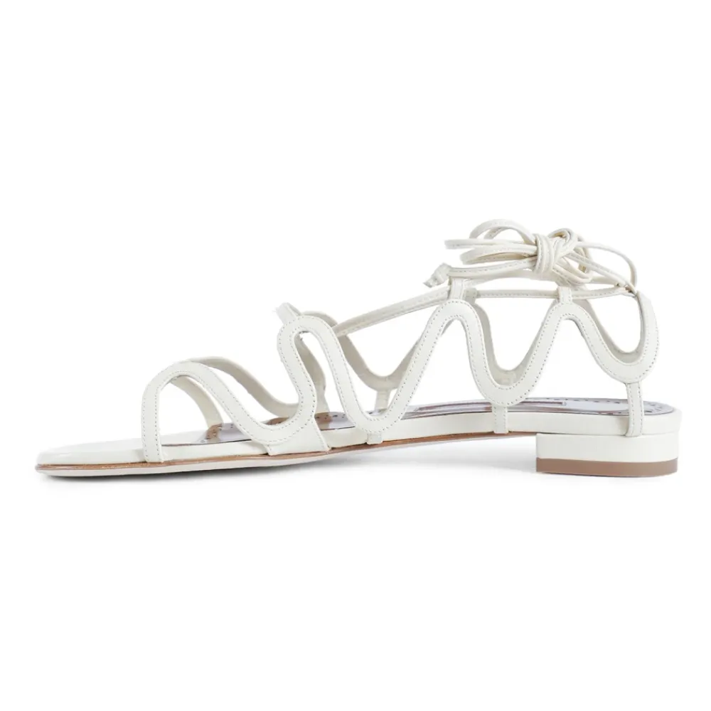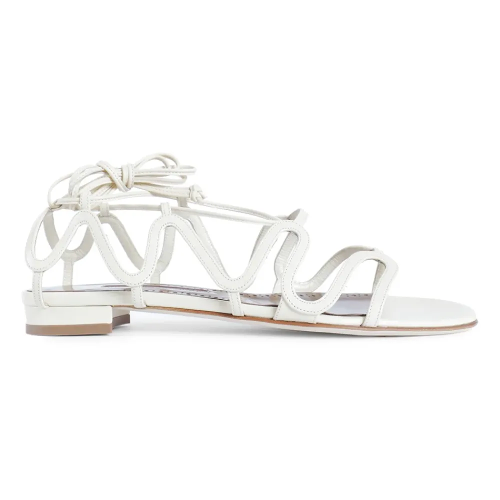 Forkæl dig selv med disse flade sandaler fra Manolo Blahnik i lys fløde. Med en udskåret burdesign, selvbindende ankelrem, lædersål og stablet hæl er disse sandaler perfekte til den modebevidste kvinde.