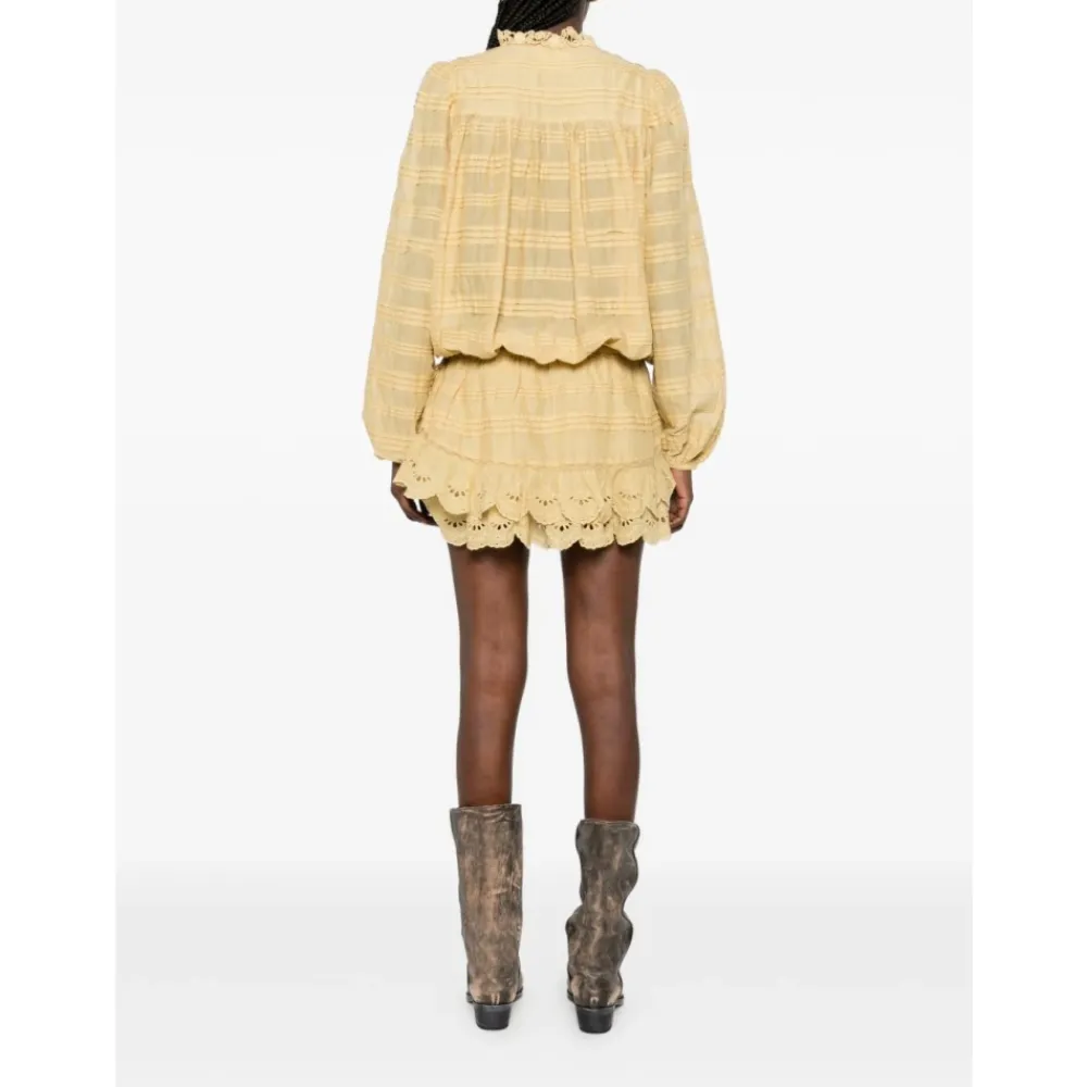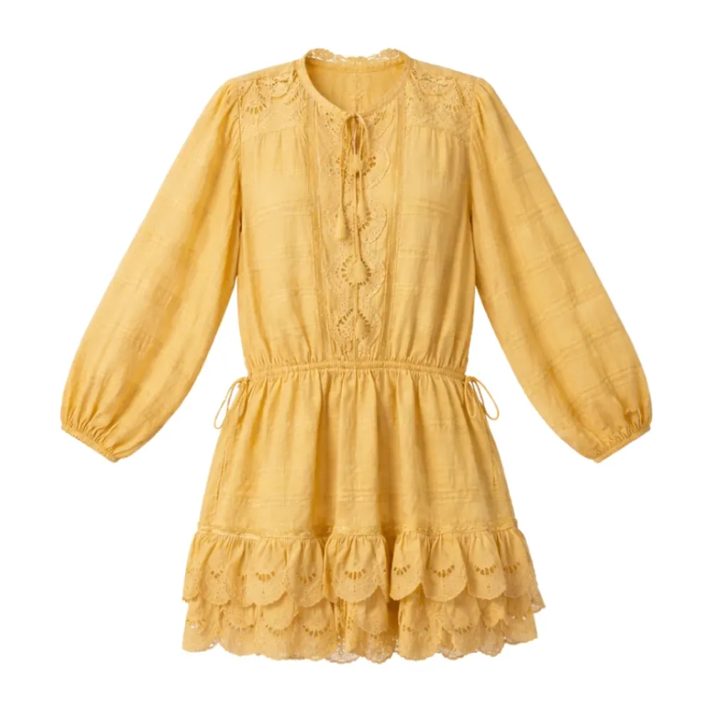 Marant étoile Preya Dress er en kort, flæsebesat hverdagskjole, der kombinerer broderede blonde detaljer med en snøre i taljen for et let, feminint hverdagslook. Ideel til afslappede udflugter og weekendbrug. Nøgleattributter: Gul | Lys okker | Bomuld | Bindebånd i halsen | Elastiske manchetter | Elastisk talje med snøre | Lukning foran i halsen | Tunisisk bindebånd i halsen med pompon snore | Lange ærmer med elastiske manchetter | Flæsebesat skørt med læg | Blomsterbroderi og blonde detaljer | Bølgekant | Flared snit | Dimensioner & pasform: Løs pasform | Normal i størrelsen | Elastisk talje for justerbar formning | Flared kort silhuet | Sammensætning & pleje: 100% bomuld | Maskinvask på et skåneprogram, vrangen ud, maks. 30°C.