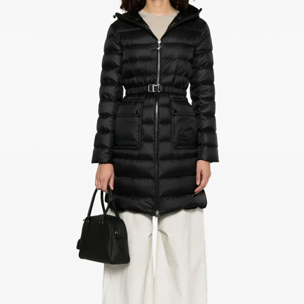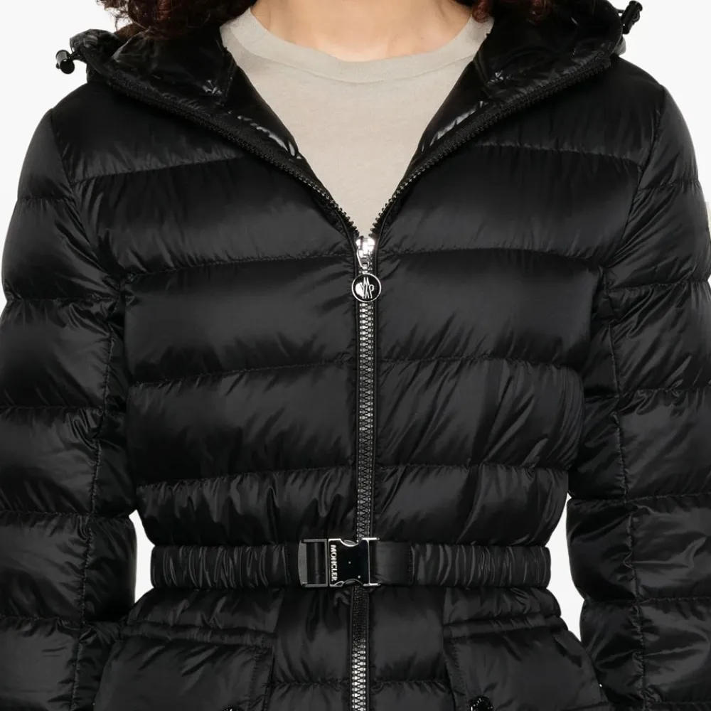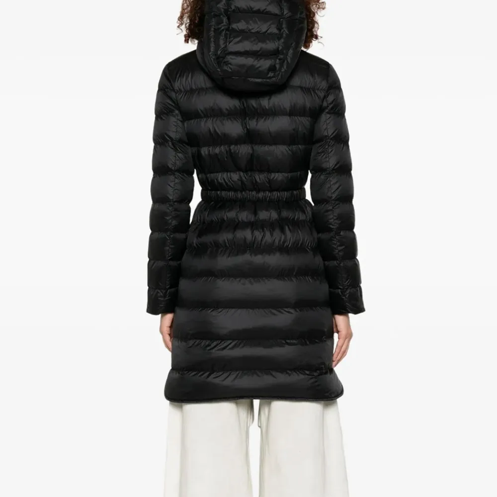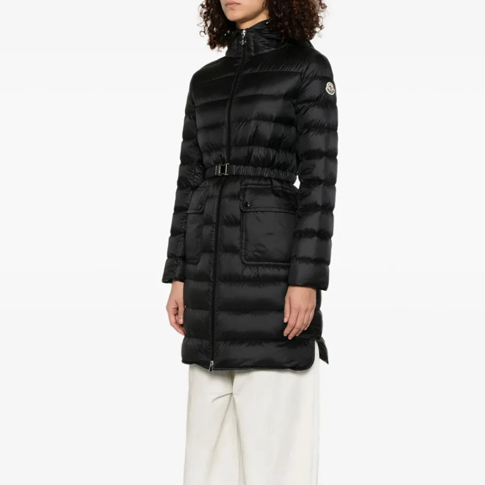 Hold dig varm og stilfuld i denne klassiske sorte Moncler parka til kvinder. Lavet af 100% polyamid med 90% dun og 10% fjer, denne parka har en justerbar hætte, lynlåslukning og to frontlommer med logo trykknap. Den har også et aftageligt bælte for en flatterende pasform.