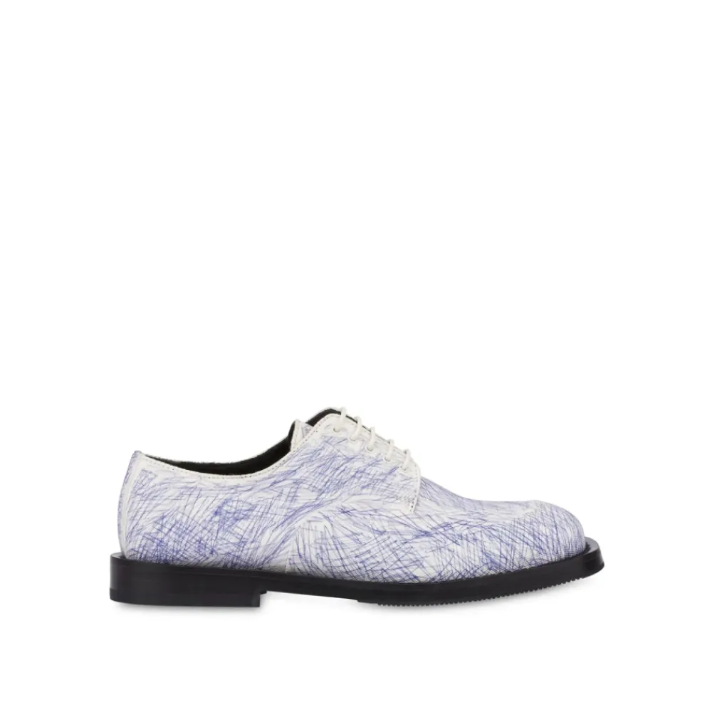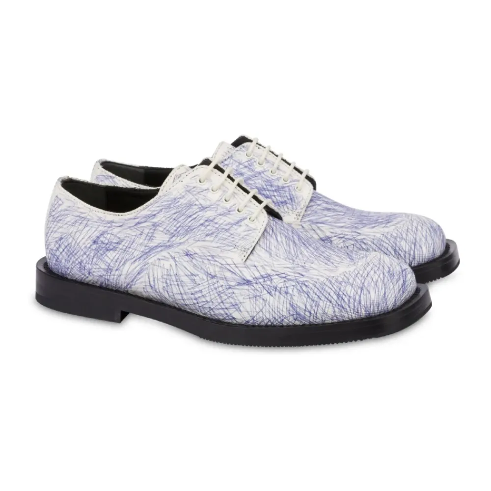 Opgrader din stil med disse Blå Scribble Print Derby Sko fra Moschino, der har et unikt doodle-print og en slidstærk lædersål. Produkt detaljer: Multifarvet | Grå | Bomuld | Snørelukning | Doodle-print | Derby-stil | Kontrasterende fuldnarvet lædersål | Sammensætning og pleje: 100% bomuldsoverdel | 100% læderforing | 30% gummi, 70% lædersål | Aftørres med en fugtig klud