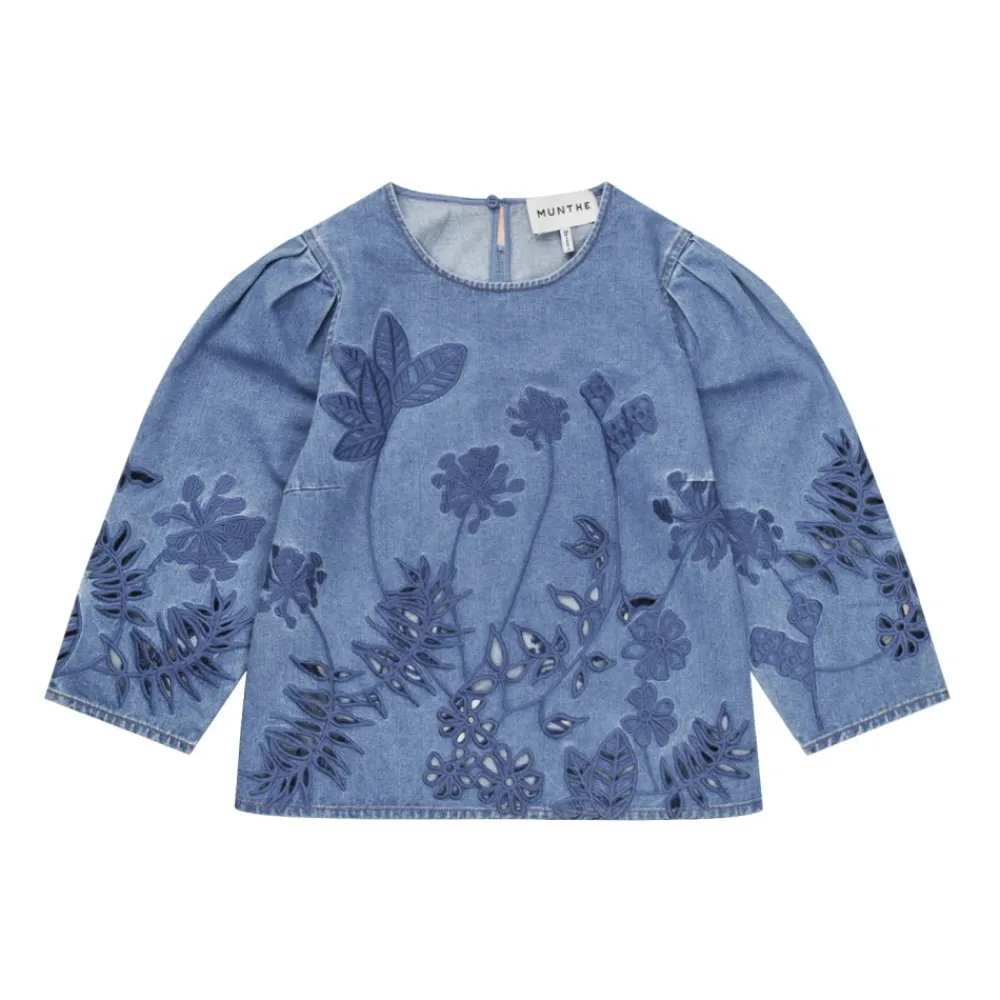 Munthe bluse i blå, tilgængelig i størrelse 36. En alsidig del til lagdeling og smart-casual beklædning. Vigtigste egenskaber: Blå