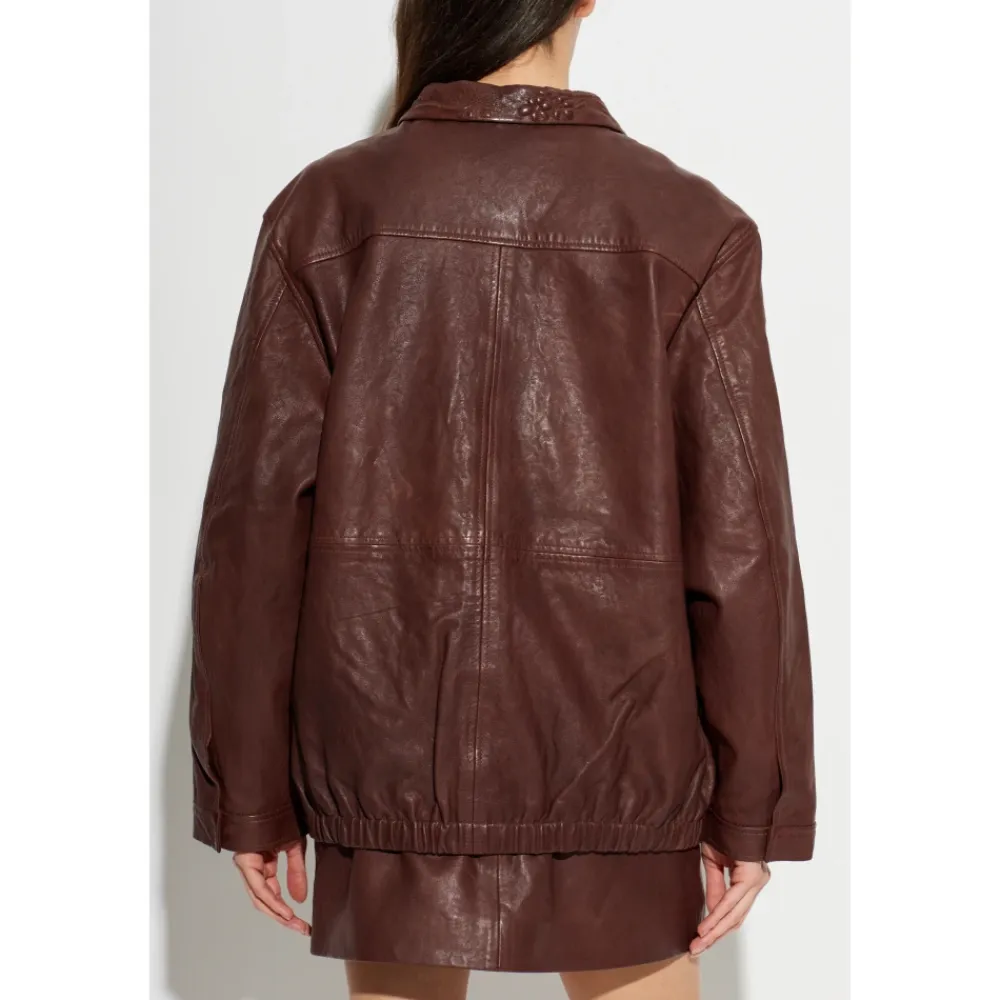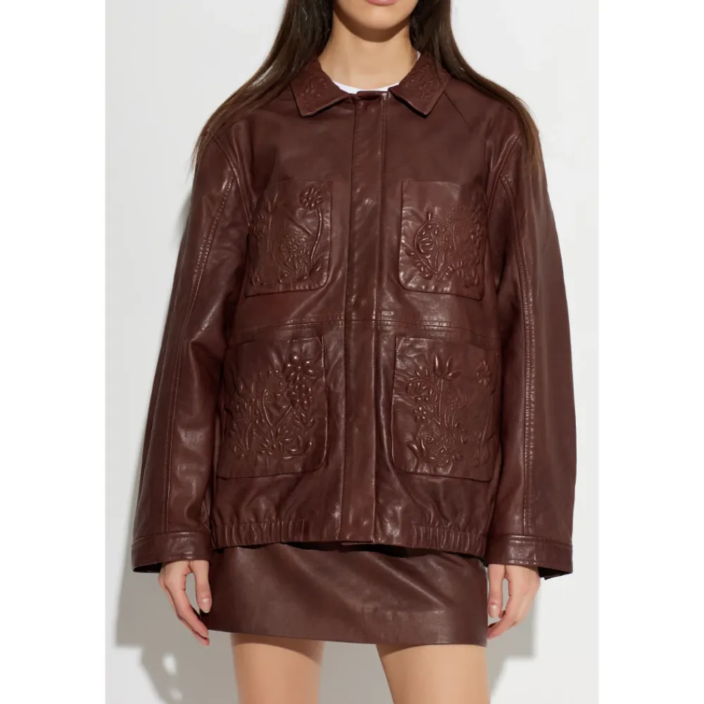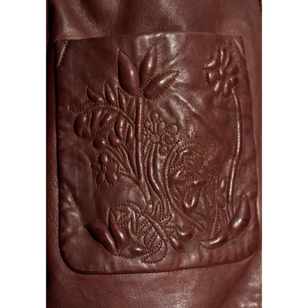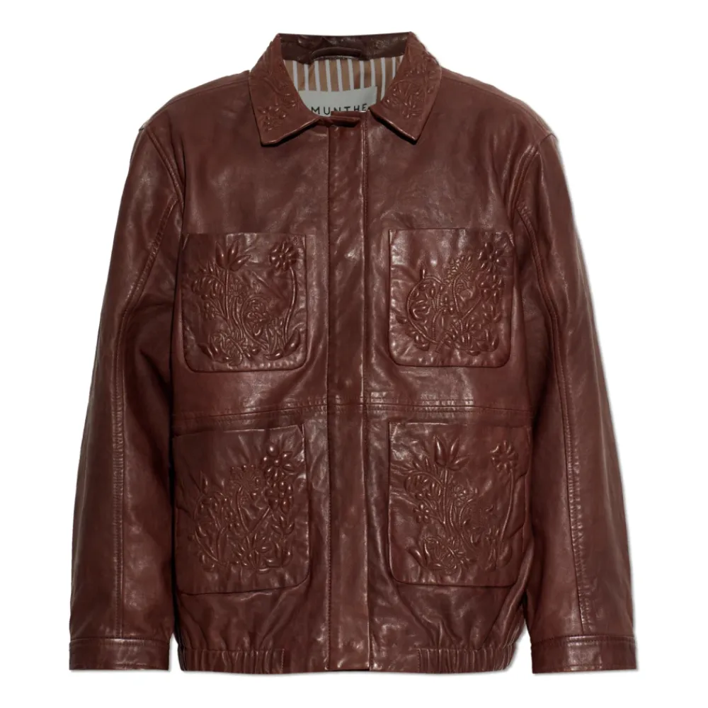Munthes Baram Læderjakke kombinerer glat lammeskind med blomsterprægede påsyede lommer og en minimalistisk krave. Dens rene, oversized silhuet er velegnet til et elegant hverdagslook. Vigtigste egenskaber: Brun | Chokoladefarvet | Lammeskind | Fire påsyede lommer | Skjult lynlås foran | Blomsterprægning på påsyede lommer | Minimalistisk lige krave | Skjult lynlås under læderstolpe | Rent frontdesign uden synlig branding | Glat læderfinish | Mål og pasform: Modelhøjde: 177 cm | Bryst: 83 cm | Talje: 61 cm | Hofter: 89 cm | Oversized pasform | Modellen er iført størrelse 36 | Sammensætning og pleje: Lammeskind
