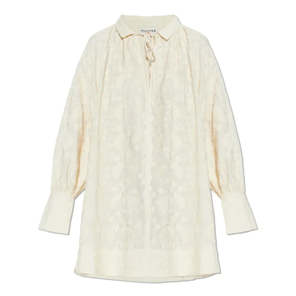 Munthe Betulli Kjole præsenterer en oversized mini silhuet med fremtrædende botanisk broderi og en V-hals med bindebånd – perfekt til raffineret hverdagsstyling eller elegante afslappede aftener. Nøgleattributter: Beige | Creme | Letvægtsstof | Bindebånd i halsudskæringen | Oversized mini A-linje silhuet | Stand-up krave, der overgår til et revers | Dyb V-halsudskæring med bindebånd | Lange ærmer med dropped shoulders | Fremtrædende botanisk broderi | Dimensioner & pasform: Oversized pasform | Mini længde | A-linje silhuet