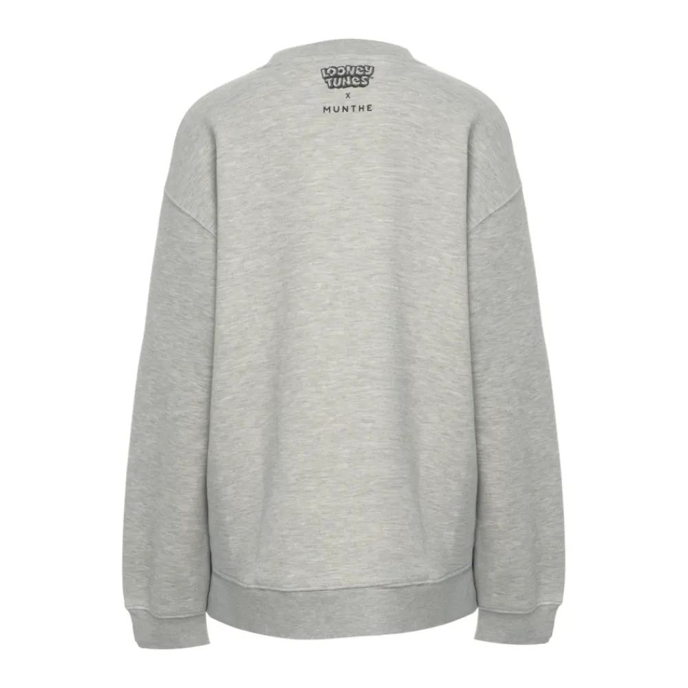 Munthe Lami Sweatshirt kombinerer en blød fornemmelse med et karakteristisk frontprint, med en Bugs Bunny chenillebrodering og et MUNTHE emblem print for et afslappet hverdagslook. Nøgleattributter: Lys grå | Bomuldsblanding | Blødt stof | Ribkanter ved manchetter og søm | Rund hals | Lange ærmer | Frontprint | Chenillebrodering | Dimensioner & pasform: Oversized fit | Sammensætning & pleje: 50% Bomuld | 50% Polyester