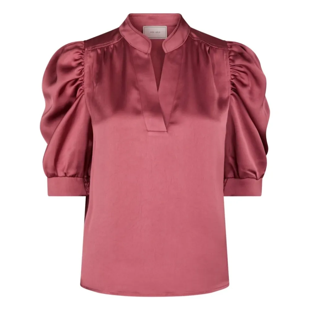 Neo Noir Roella Heavy Sateen Blouse kombinerer en satinlignende finish med feminine detaljer, der passer til både hverdagsbrug og festlige lejligheder. Blusen har en V-udskæring og bløde 3/4 pufærmer, der giver en struktureret, men afslappet silhuet. Nøgleattributter: Pink | Cherry pink | Polyester | Pullover (ingen lukning) | V-udskæring | 3/4 pufærmer | Dekorativ topstitching | Kraftig satinvævning | Sammensætning og pleje: 97% polyester, 3% elastan