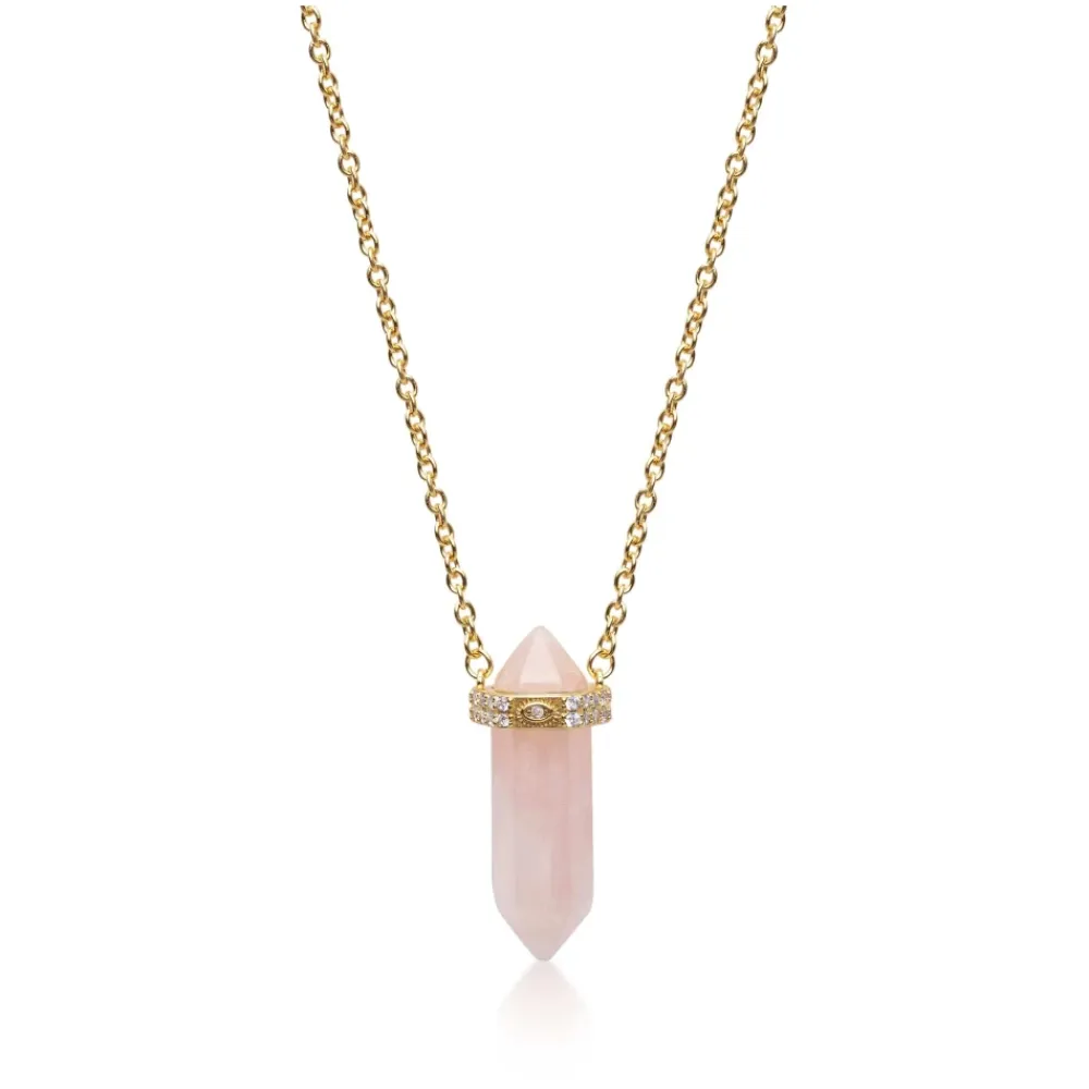 Rose Quartz Pendant with Evil Eye Setting in 925 Sterling Silver with Gold Plating Chain in Stainless Steel with Gold Plating Clear CZ Diamonds Length: 18 Inches + 2 Inches / 45.72 cm + 5.08 cm Product Code: WNECK_111 Designer’s NotesThis stunning necklace features a hand-cut rose quartz crystal that is elegantly edged into a CZ-adorned sterling silver ring with gold plating. A hand-carved evil eye in the center of the ring gives this piece a spiritual yet unique touch. The rose quartz, which is considered the stone of love, this necklace is a talisman full of positive vibes and unconditional love. The evil eye talisman, also known as a nazar, is a symbol of protection believed to ward off the malevolent glare of jealousy and ill will. The belief is that the eye absorbs negative energy, keeping the wearer safe from harm. Please note that all our pieces are crafted by hand and one-of-a-kind, and may therefore vary slightly in size, shape, and color.