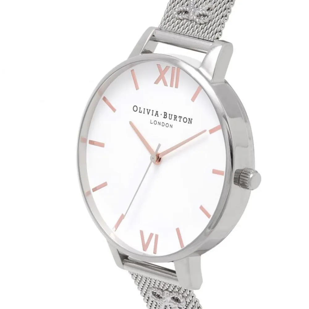 Olivia Burton ur med en ren hvid urskive og et armbånd i rustfrit stål. Designet til hverdagsbrug med et klassisk analogt display og en skyde-lås for nem justering. Vigtigste egenskaber: Hvid | Sølv | Rustfrit stål | Vandafvisende 1 ATM | Skyde-lås | Quartz urværk | Analog display | Hvid urskive | Mineralglas | Rund urkasse | Mål & pasform: Diameter urskive: 38 MM | Sammensætning & pleje: Rustfrit stål | Stål | Mineralglas