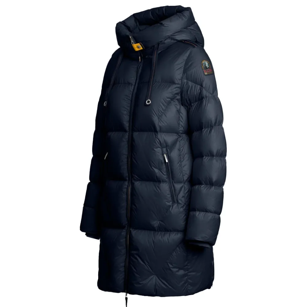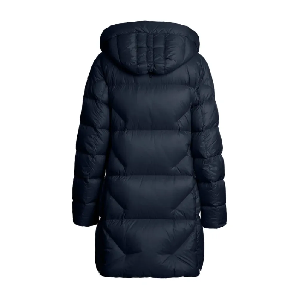 Hold dig varm og stilfuld i denne lange marineblå dunjakke med hætte, lavet af nylon af Parajumpers. Har en tovejs lynlåslukning, justerbar hætte med snøre, to ydre lynlåslommer og en indvendig netlomme. Ribkanter, lynlåse i siderne, Parajumpers-logo på ærmet og ikonisk aftagelig gul tape ved halslukningen.