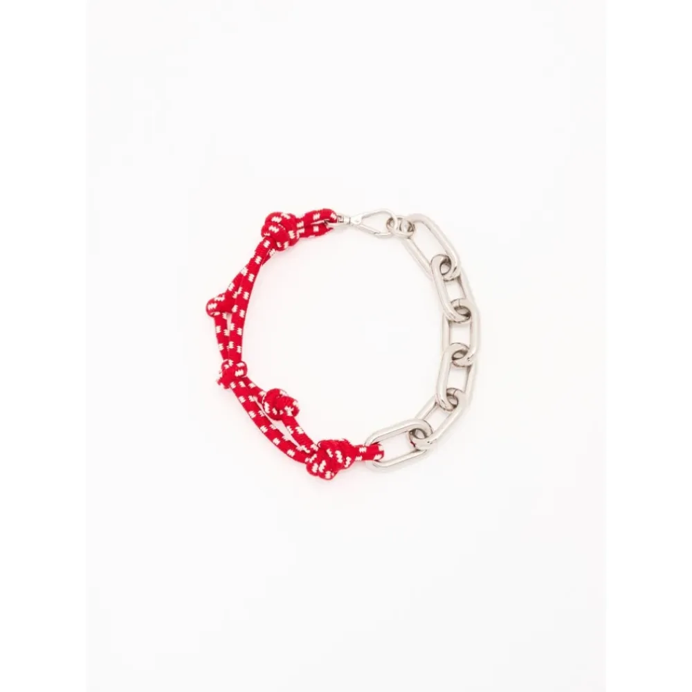 Plan C Knotted Cord Chain Necklace kombinerer en knyttet snor med en markant kæde for teksturerede, opsigtsvækkende halsbeklædning. Designet til hverdagsstyling eller lagdelte looks, tilføjer den taktil kontrast til simple outfits. Nøgleattributter: Rød | Knyttet snor | Kædeled