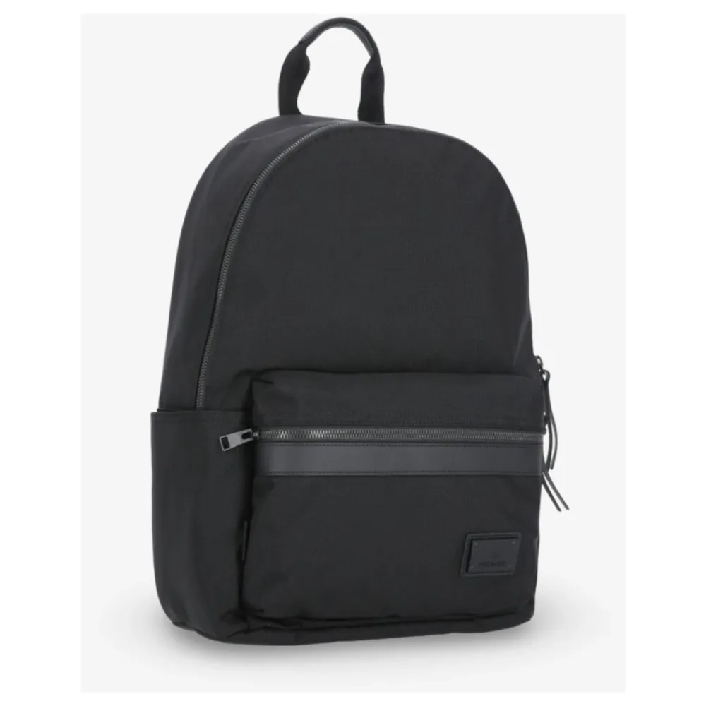 En rummelig og alsidig model lavet af premium nylon gabardine med anti-flis og vandafvisende behandling. Polstrede EVA-skulderstropper for ekstra komfort. Vandtætte forlommer med kalveskindslæderkant og matte metal lukninger. Logo-præget gabardineforing. Sort lux metal lynlås Side lomme Læderbælte Læderforet håndtag Justerbare skulderstropper Gummistropper Logo plade i mat sort Ekstern side pc-lomme